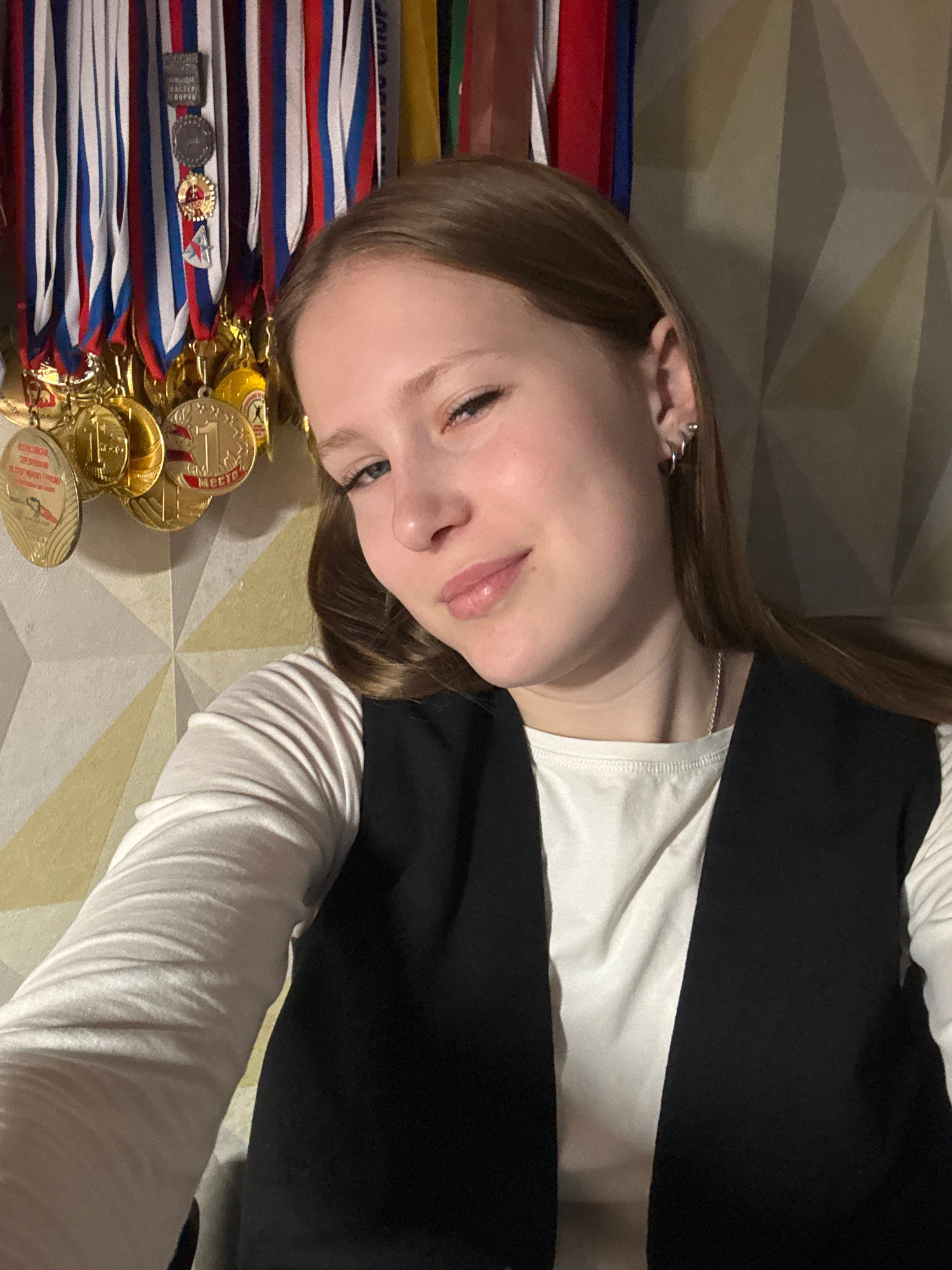 A young woman is depicted indoors, casually posing amidst a collection of numerous gold medals. She has long, light brown hair, which is parted to one side and falls over her shoulders. She wears a wh…read more