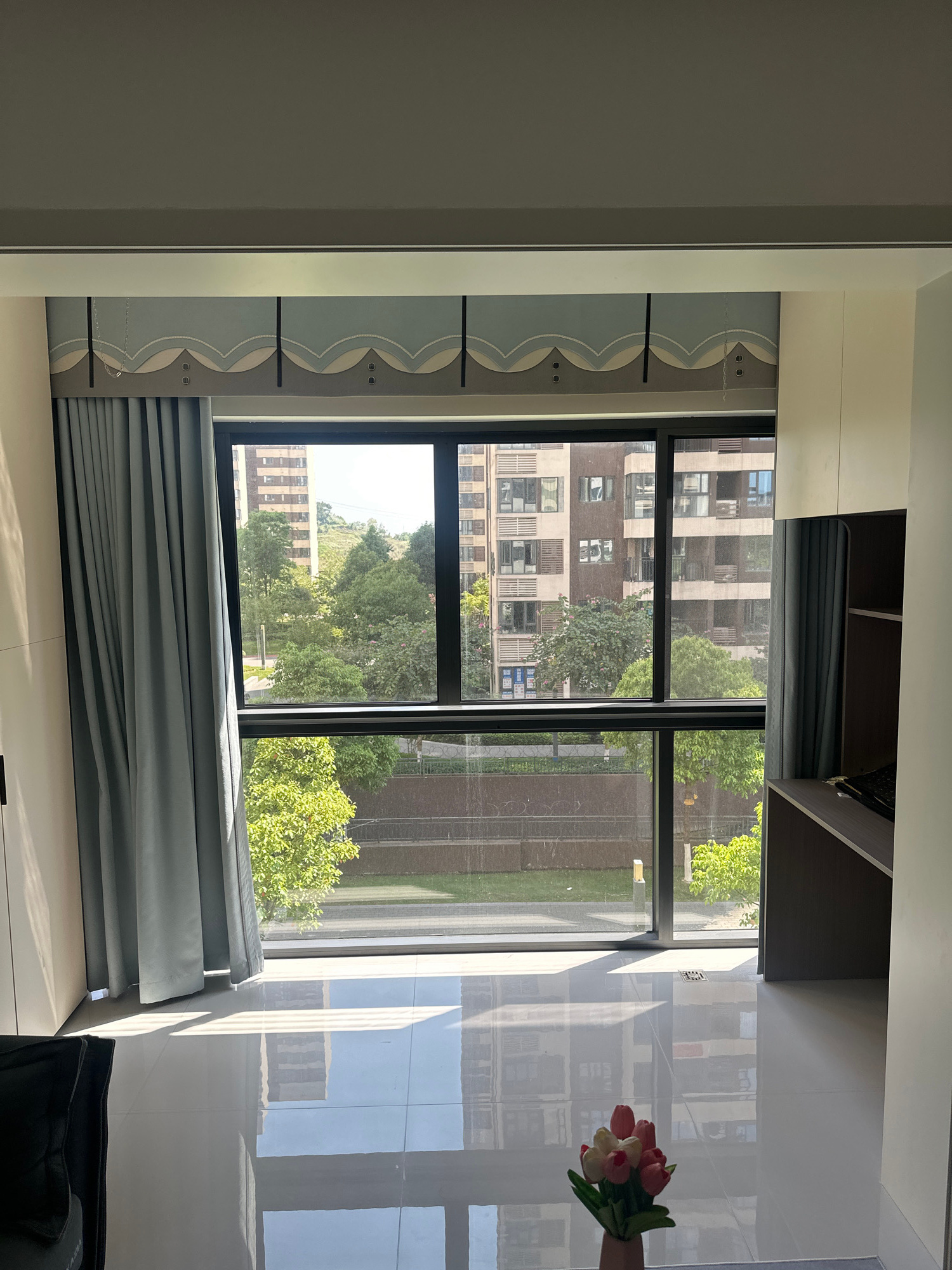 The image captures an interior view through a large window, revealing a typical urban scene likely located in Chongqing High-tech Zone, China. The window's dark frame contrasts with the light entering…read more