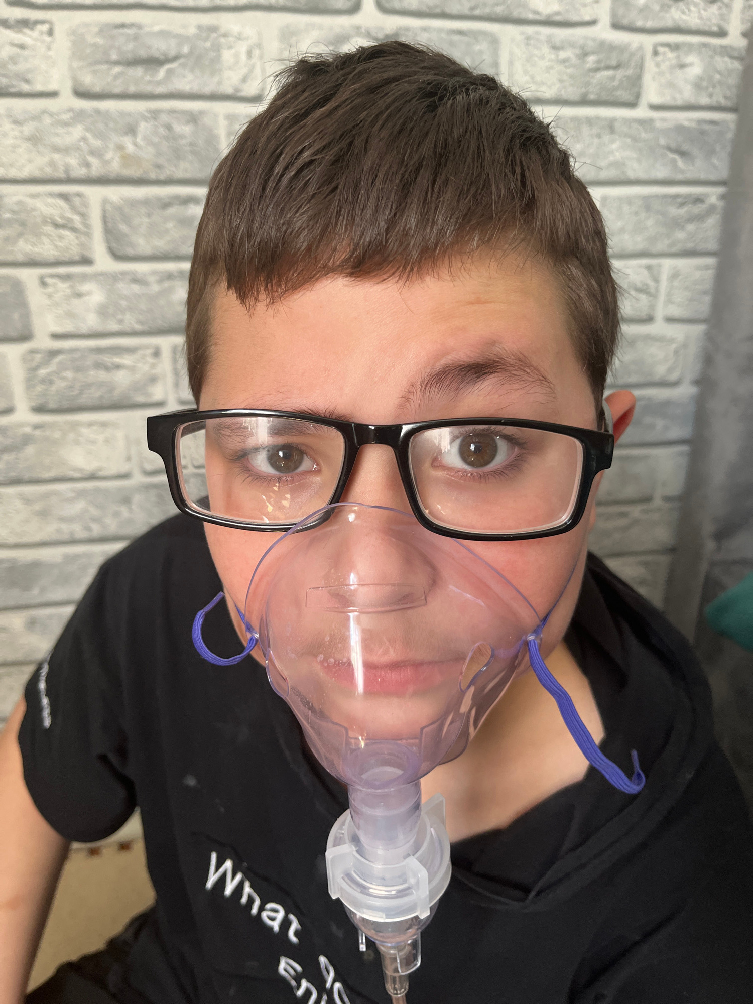 A young person, likely a child or adolescent, is depicted in a close-up, chest-up shot. They are wearing a clear plastic nebulizer mask over their mouth and nose, with blue elastic straps visible arou…read more