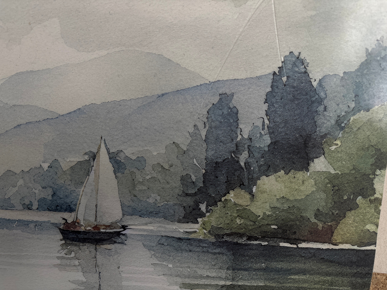 The image is a watercolor painting depicting a serene landscape scene. Environment: The painting features a body of water in the foreground, likely a lake or river, with calm reflections. The middle…read more
