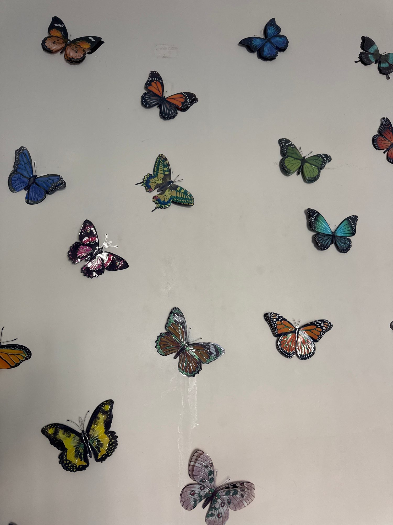 The image shows a collection of decorative butterfly ornaments adhered to a light gray surface. The butterflies vary in color, size, and pattern, with shades of blue, green, orange, brown, pink, and y…read more