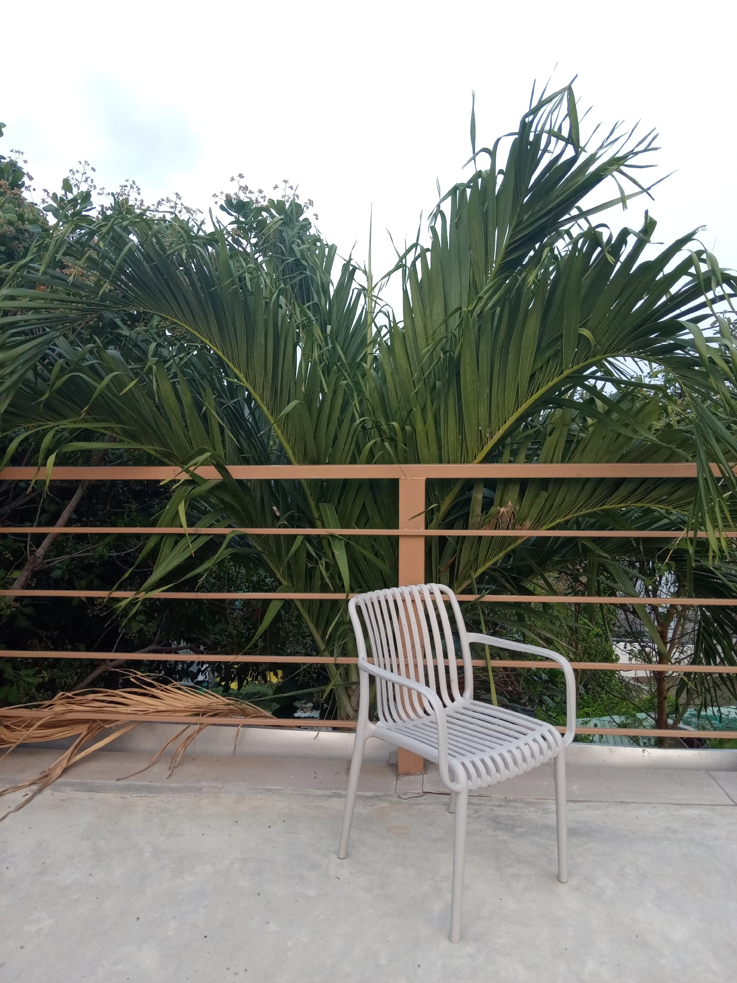 A grey, slatted chair sits on a concrete surface in an outdoor setting. Behind the chair is a metal railing and lush greenery, including palm trees. Some dead palm fronds lie on the concrete near the…read more