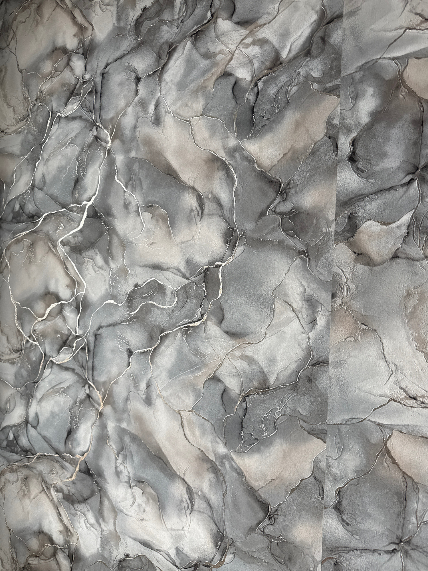 The image shows a close-up of a gray and white abstract pattern, possibly resembling marble or a fluid art technique. Thin, reflective lines accentuate the boundaries of the shapes within the pattern.…read more