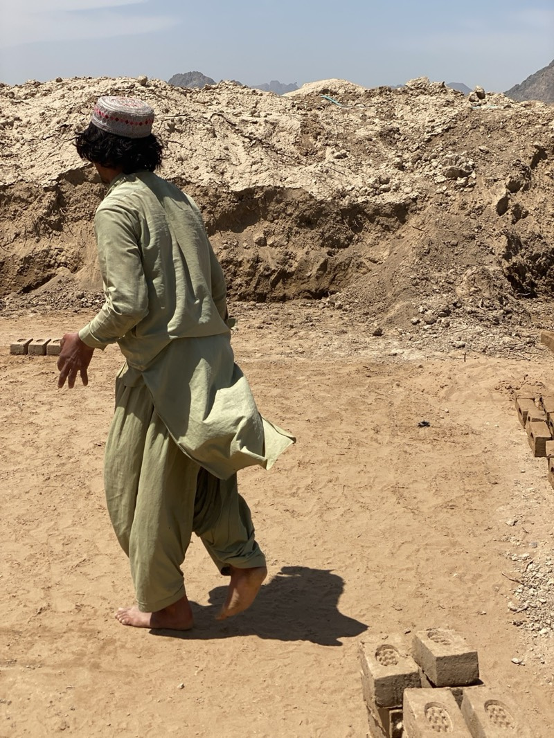 A man wearing a light green shalwar kameez and a patterned hat walks barefoot across a dusty ground in Deh-E Bagh, Afghanistan. A large mound of dirt and earth is behind him, and mountains are visible…read more