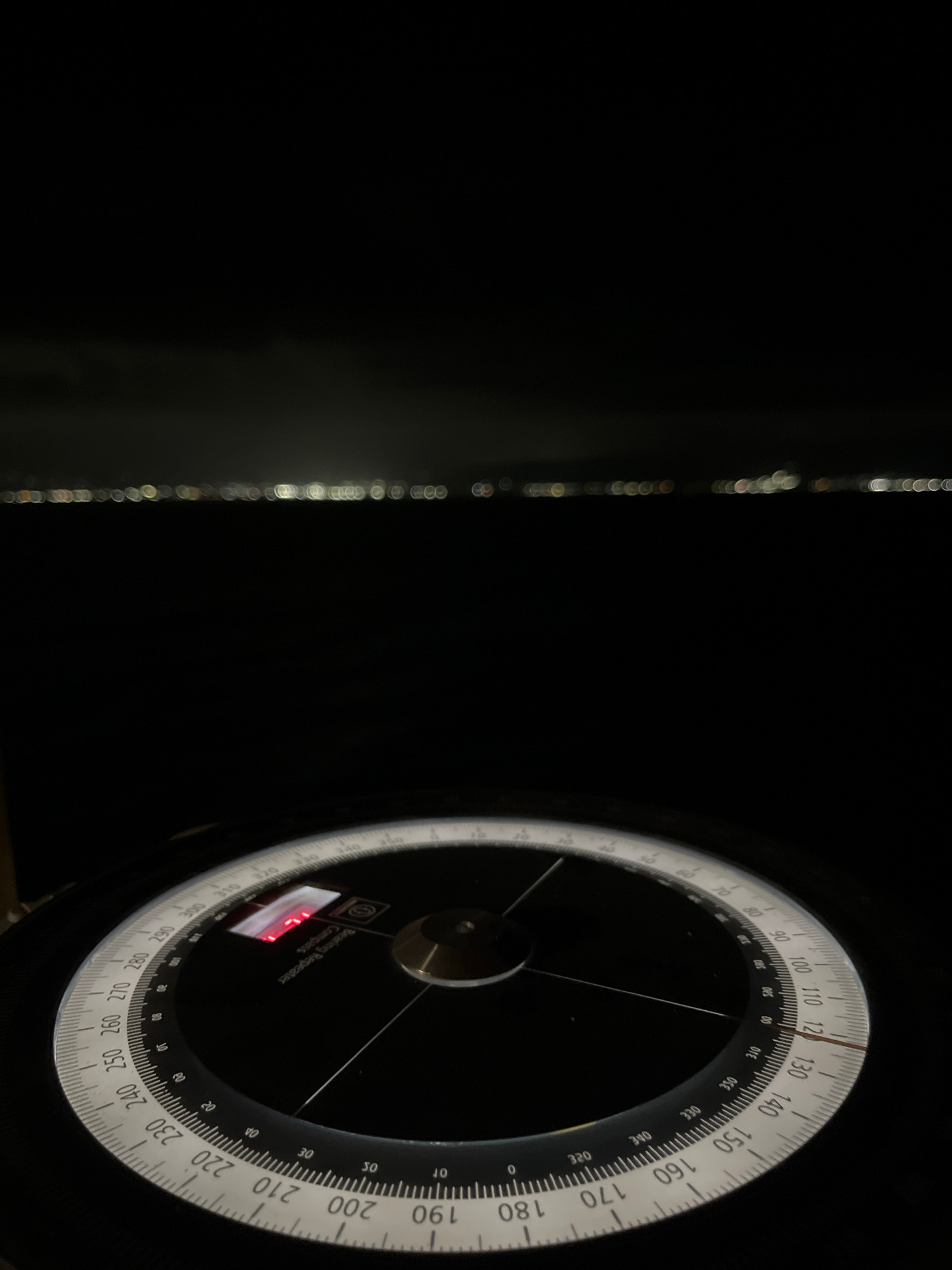 The image shows a bearing repeater compass against a dark background. The compass dial features degree markings from 0 to 360, with clear numerals and incremental lines. The compass is illuminated, hi…read more