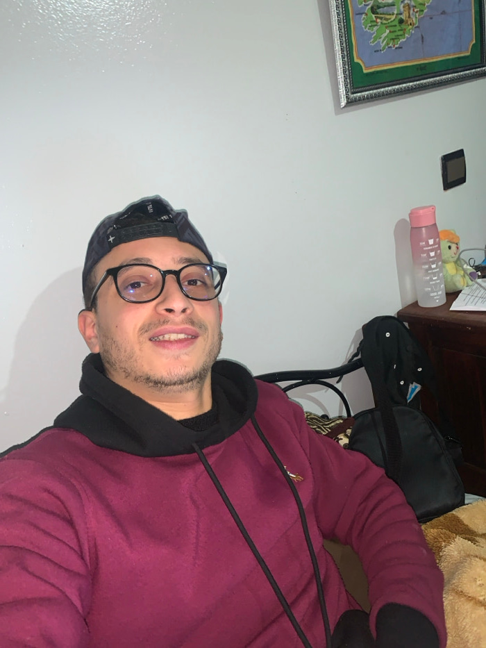 A person wearing black framed glasses and a black bandana poses. They have fair skin, short dark hair, and light facial hair. They wear a maroon jacket over a black hooded sweatshirt. The background i…read more