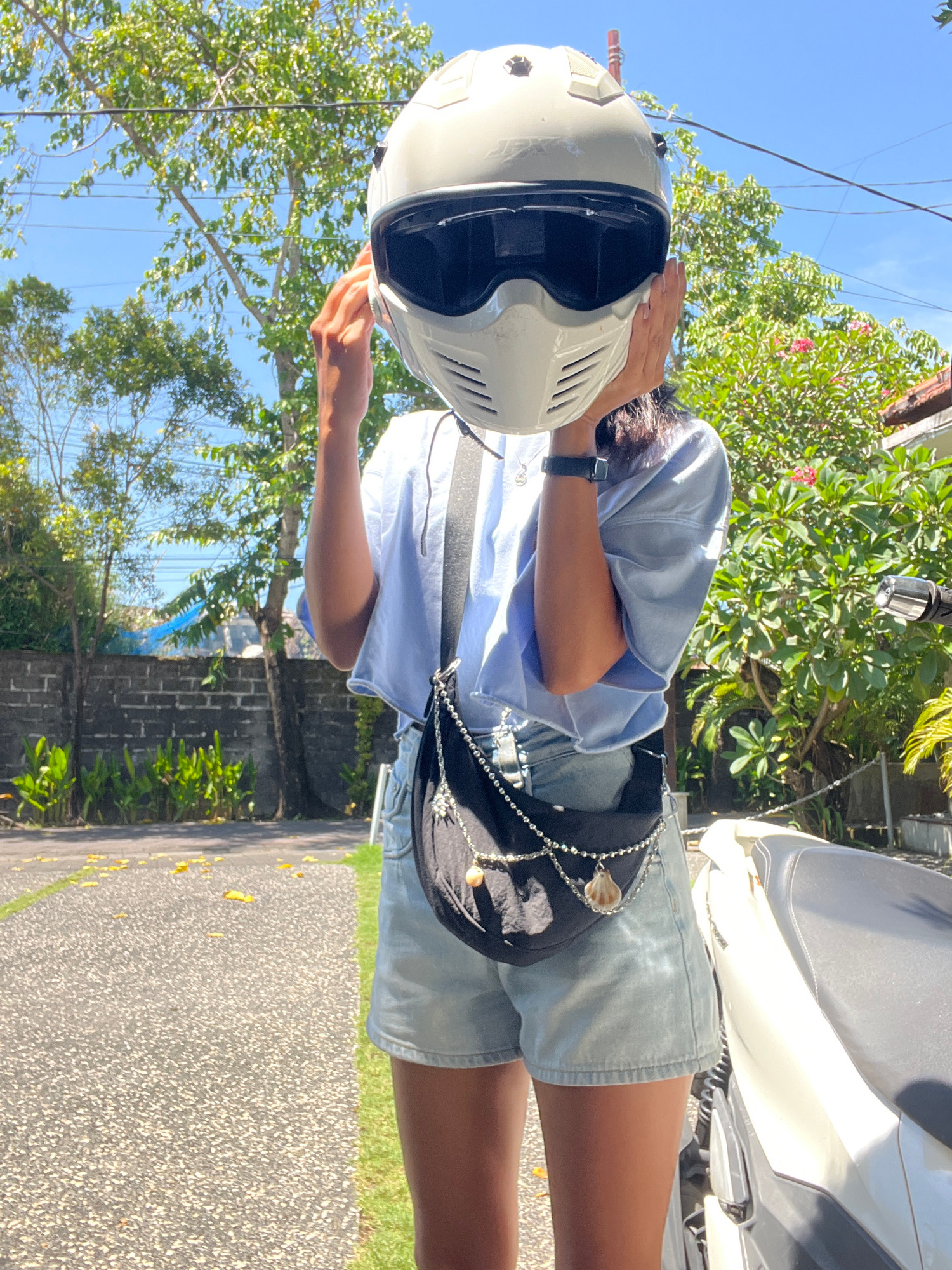 The image shows an individual in Kuta Selatan, Indonesia, standing outdoors on a paved surface next to a parked white scooter or motorcycle. They are wearing light blue denim shorts and a light blue t…read more