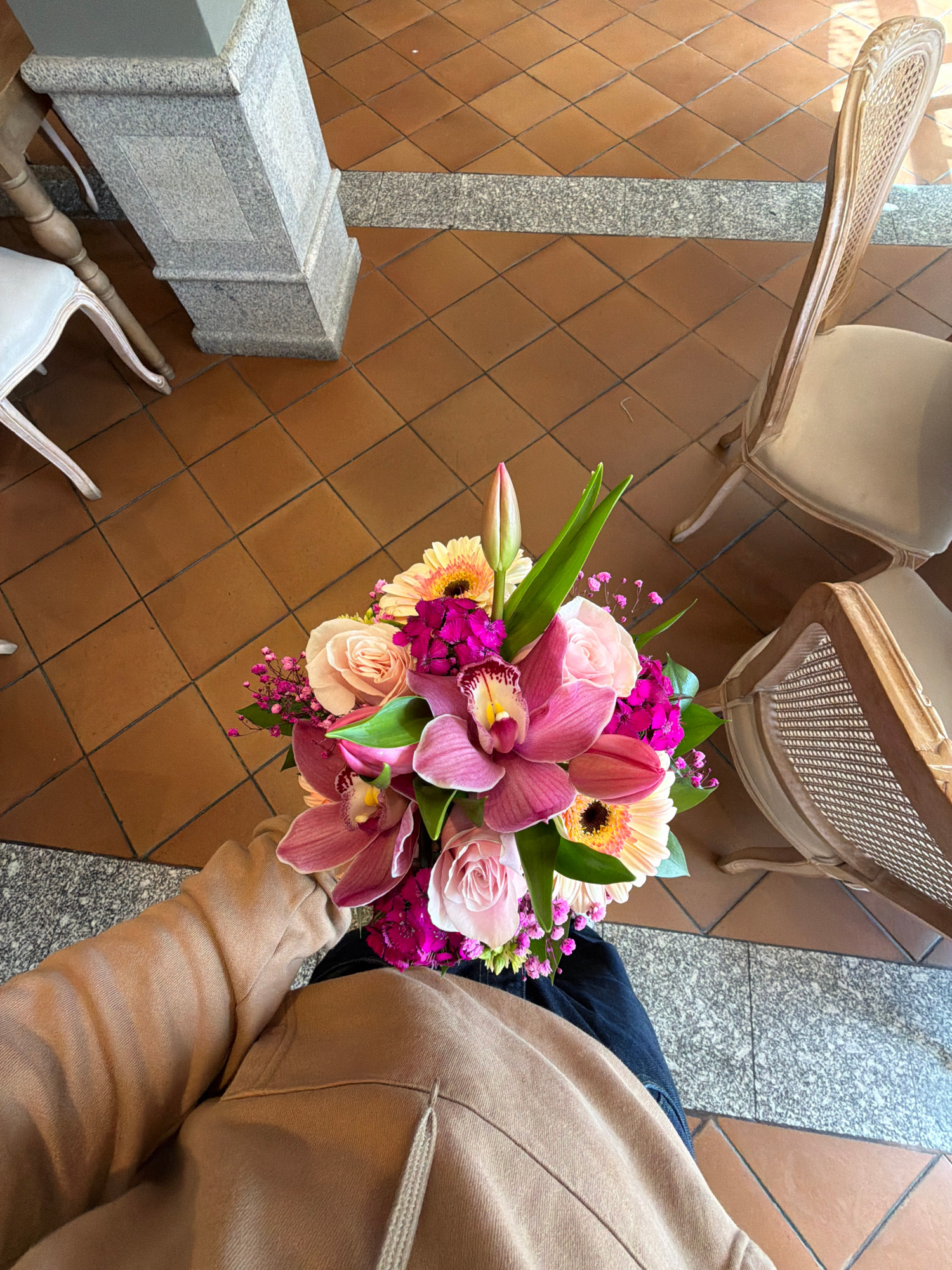 A high-angle shot depicts a person holding a bouquet of flowers in Vila Real, Portugal. The bouquet contains pink orchids, light pink roses, a peach gerbera daisy, and small purple filler flowers. The…read more