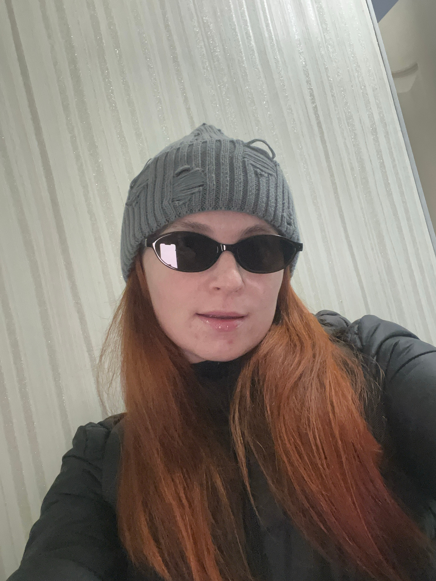 The image features a person wearing a grey knitted beanie and sunglasses. The person has red hair and is wearing a dark-colored jacket. The background appears to be a textured, striped wall. There is…read more