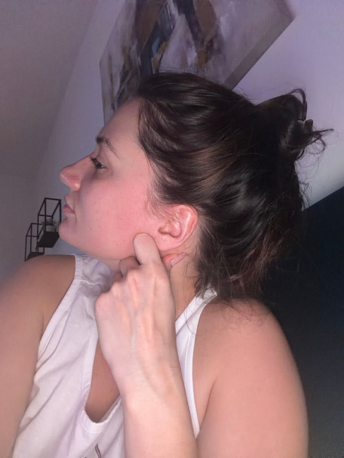 A woman in a white top is pictured from the side. Her brown hair is pulled back in a messy bun. Her face is angled downwards, and her eyes are closed. A hand is positioned on her face with a finger pr…read more