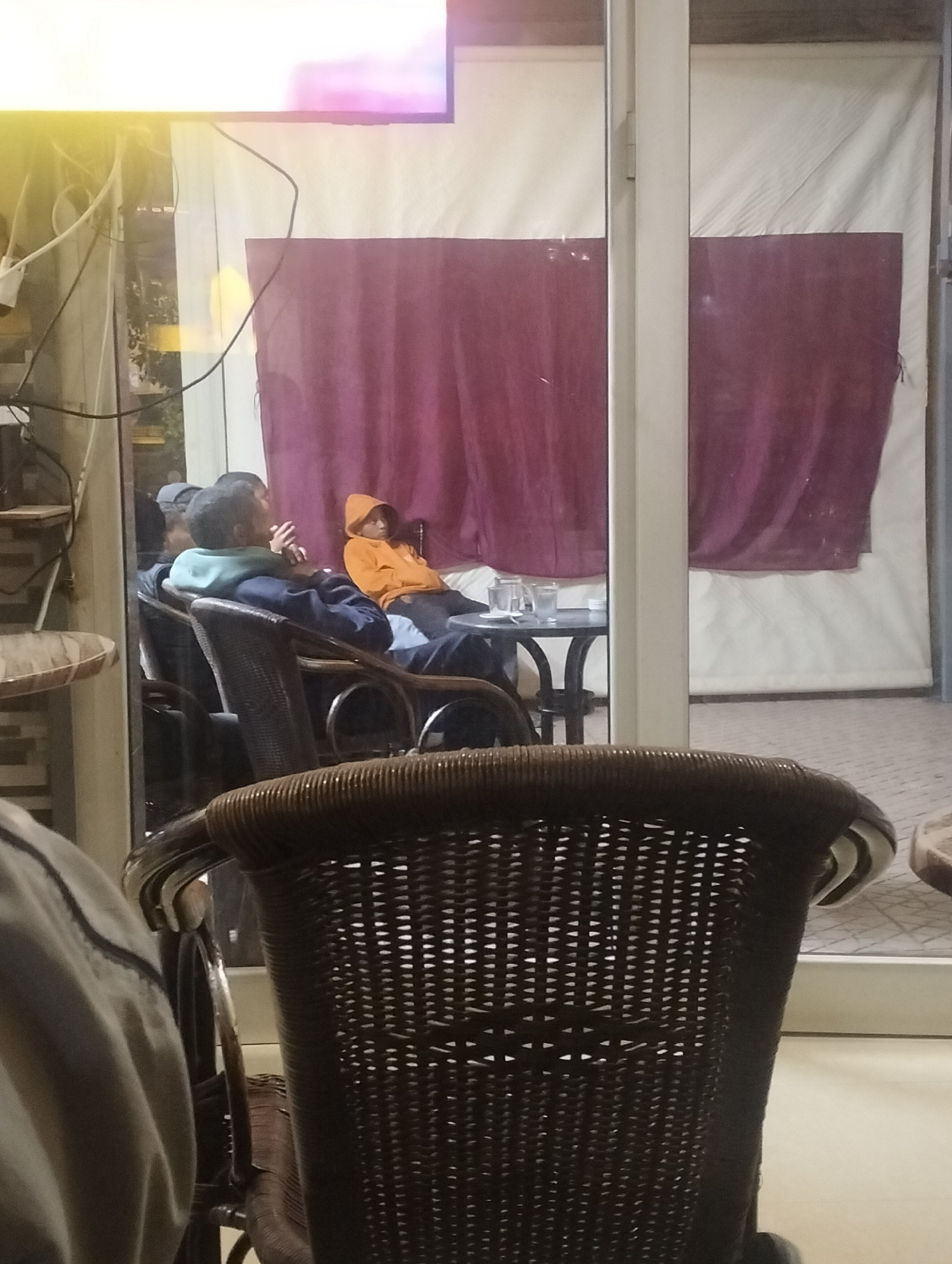 The image depicts an interior scene, likely a cafe or restaurant in Ouaouizert, Morocco, viewed through a clear glass partition from an adjacent seating area. In the immediate foreground, the back of…read more