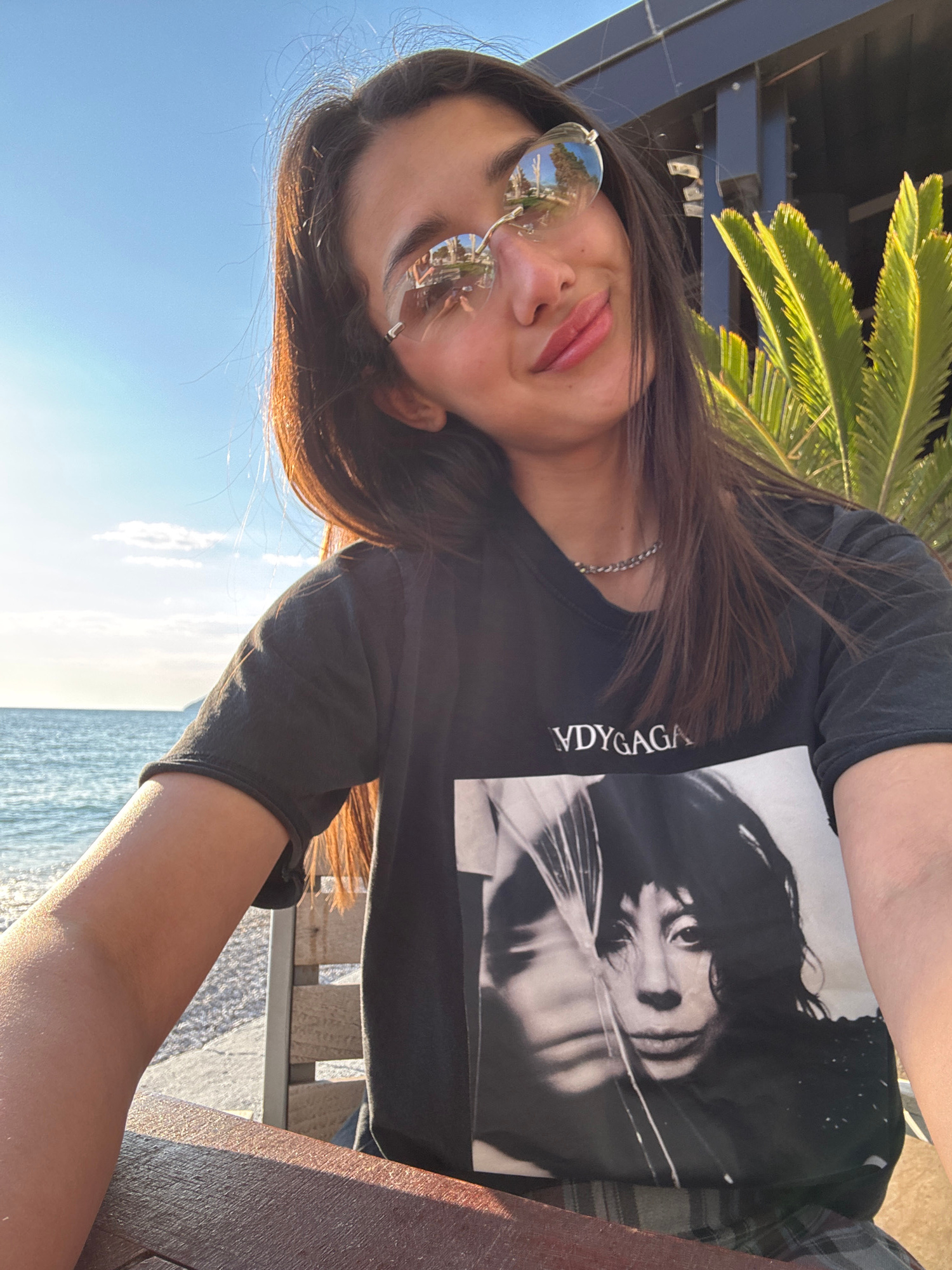 A young woman is depicted in a selfie-style photograph, taken outdoors under a clear, bright blue sky with sparse white clouds. She has long, dark hair, wears reflective, round sunglasses, and a thin…read more