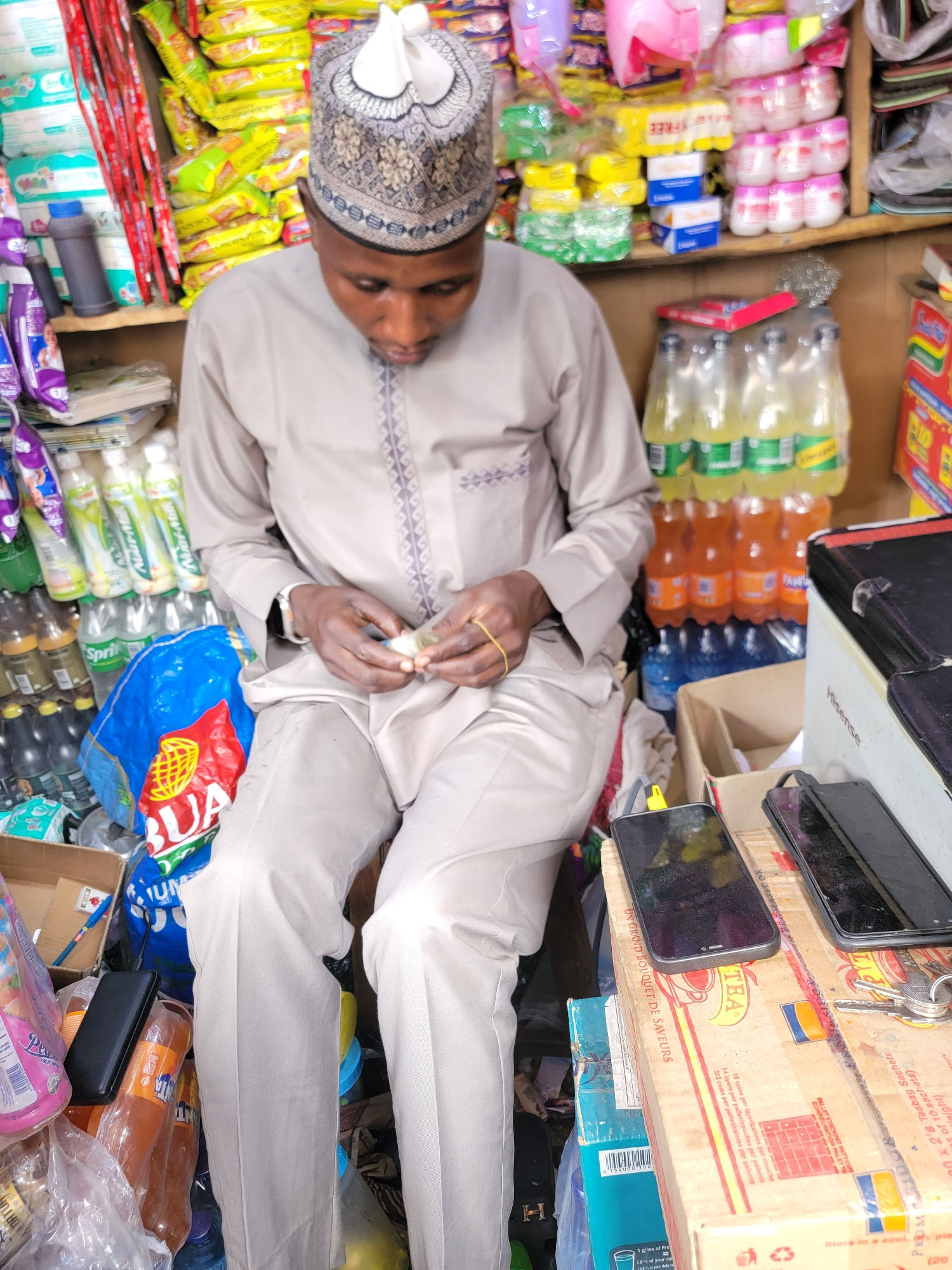 The image shows a man, presumably in Maiburiji, Nigeria, wearing a traditional cap and a light-colored garment, likely a kaftan. He appears to be handling small, rolled items. The scene is densely pac…read more