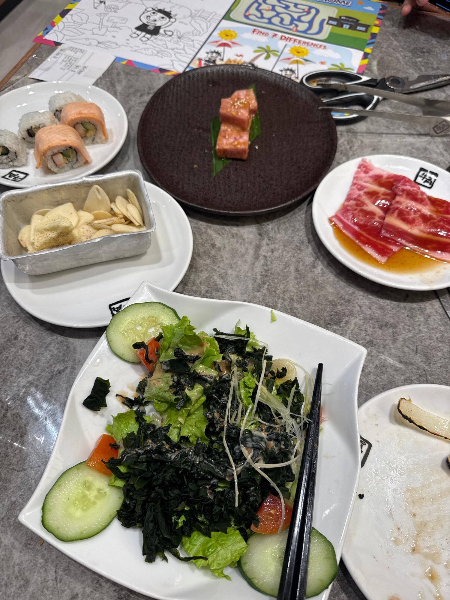 An overhead, slightly angled shot captures a spread of various dishes on a grey, textured tabletop, likely at a restaurant. The scene features a diverse selection of Japanese or Asian-inspired cuisine…read more