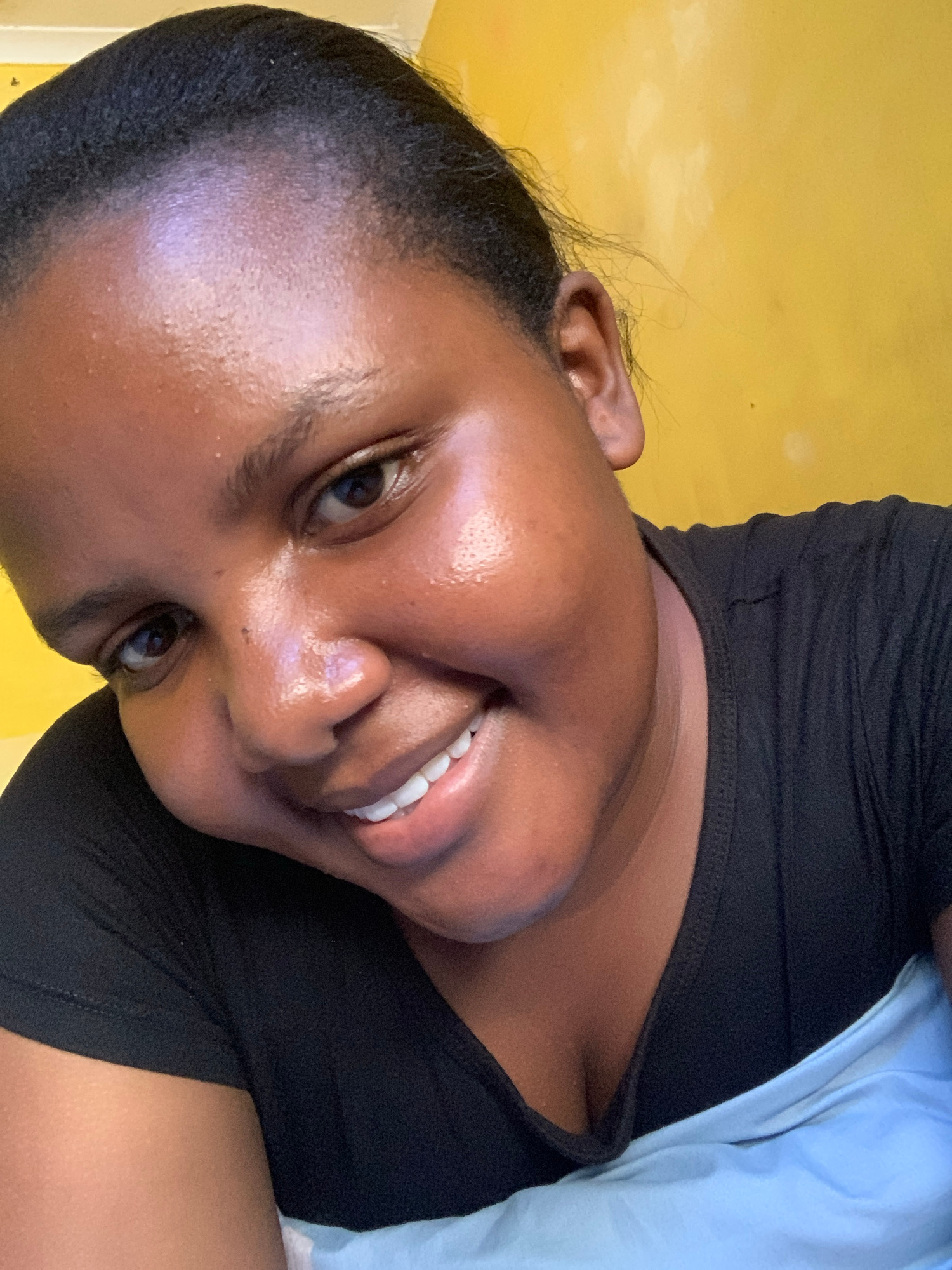 An eye-level, close-up, portrait of a young Black woman is captured indoors under natural lighting with a yellow wall in the background. The woman is smiling, exposing her upper teeth. She is wearing…read more