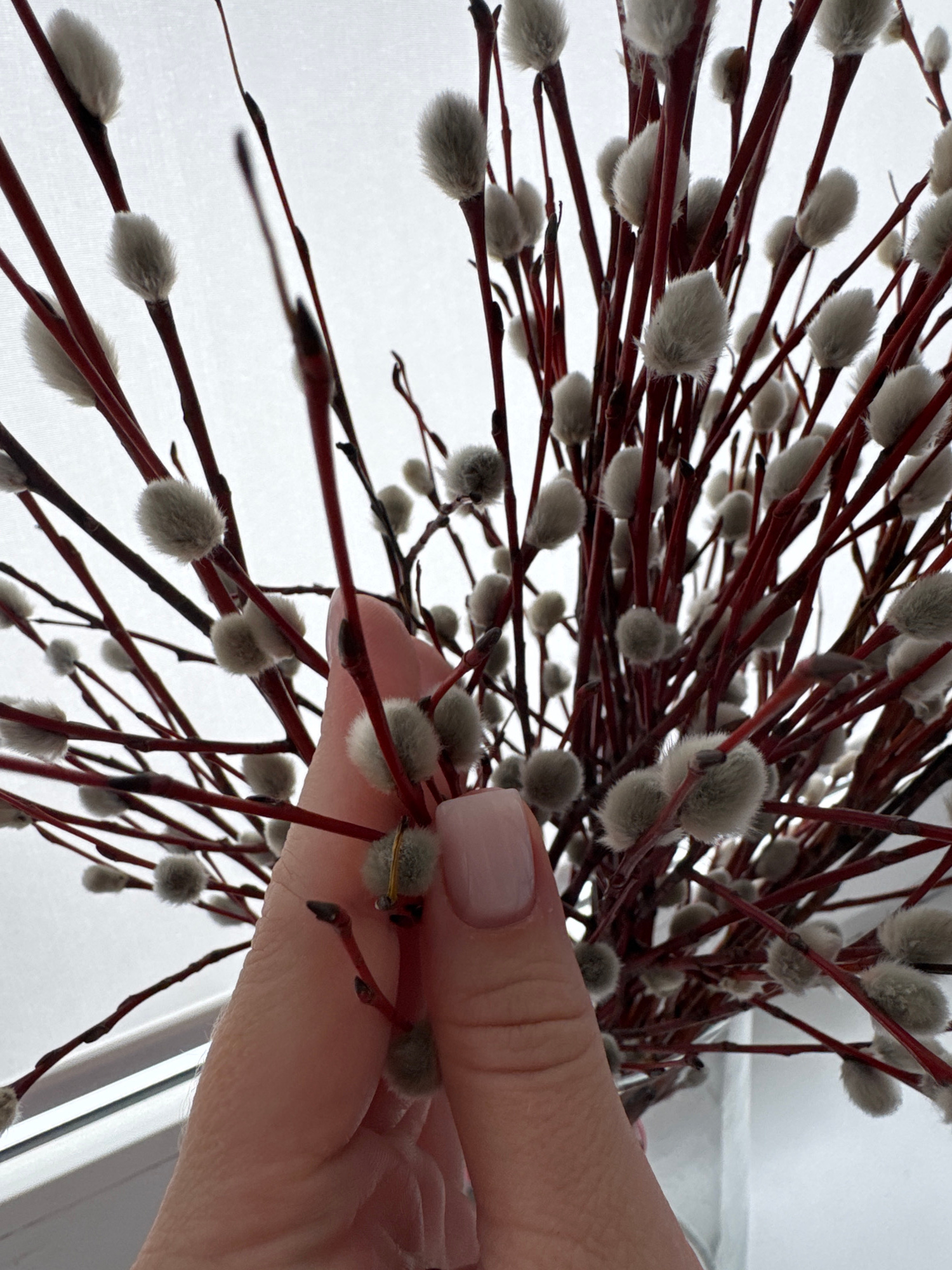 A close-up shot depicts a Caucasian person's hand holding a cluster of pussy willow branches. The hand has manicured fingernails painted with a pale pink color. The pussy willow branches feature dark…read more