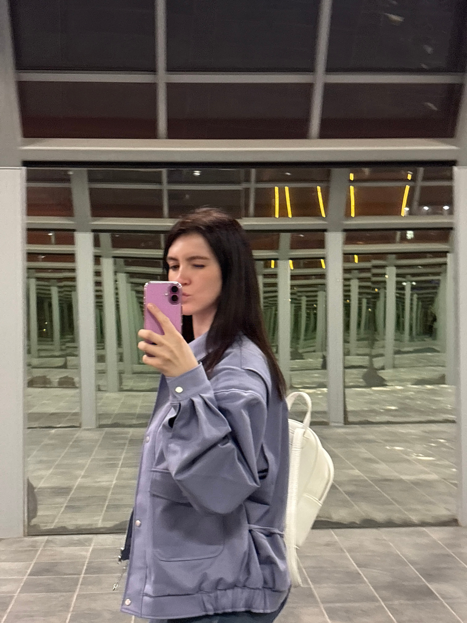 A woman is taking a selfie with a purple phone inside a mirrored hallway. The hallway appears to have a series of windows on one side, creating an infinite reflection effect. The woman is wearing a li…read more