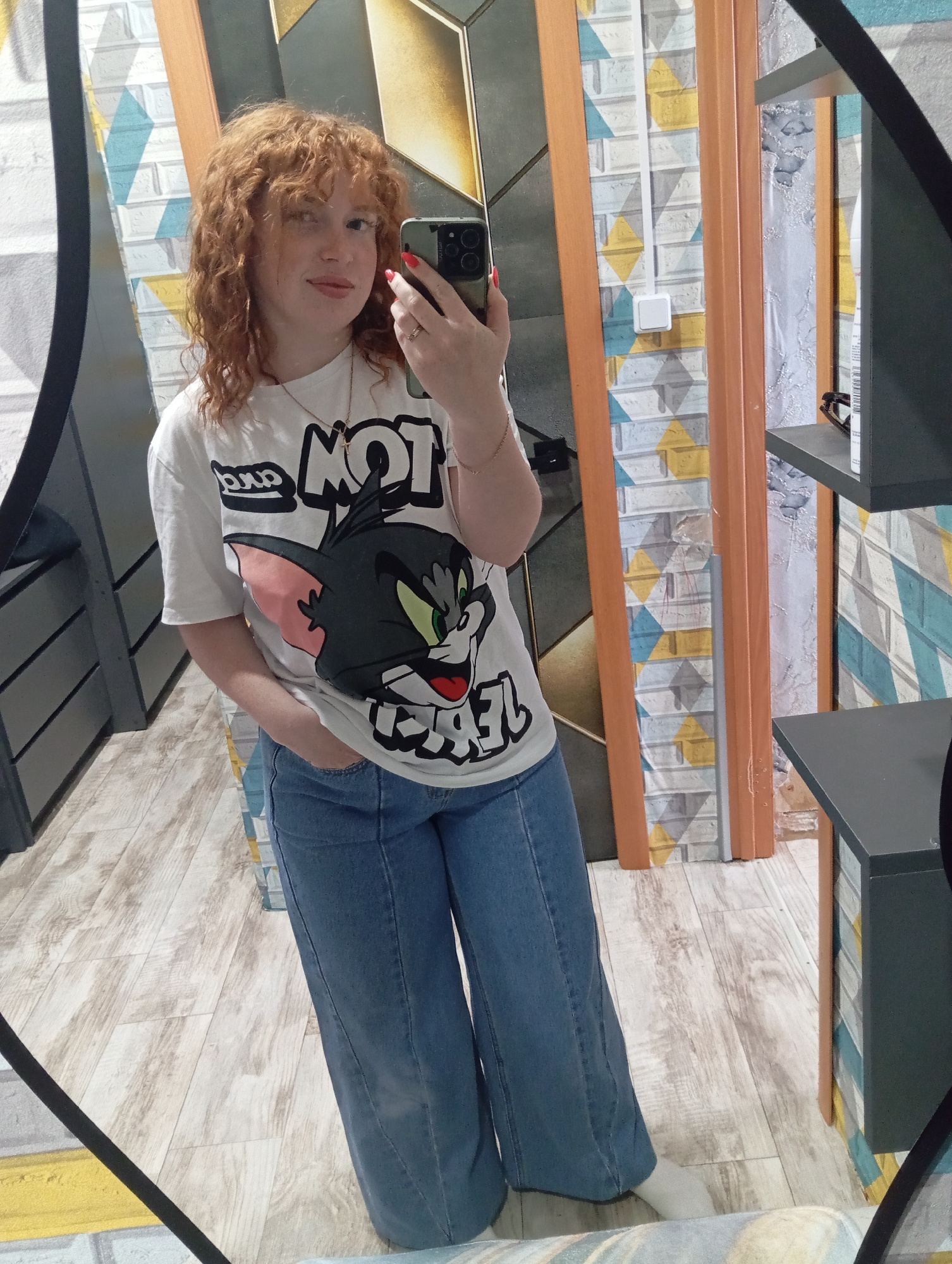 A woman with red curly hair is taking a selfie in a mirror. She is wearing blue jeans and a white t-shirt with a black and white cartoon graphic. The background includes a wall with geometric patterns…read more