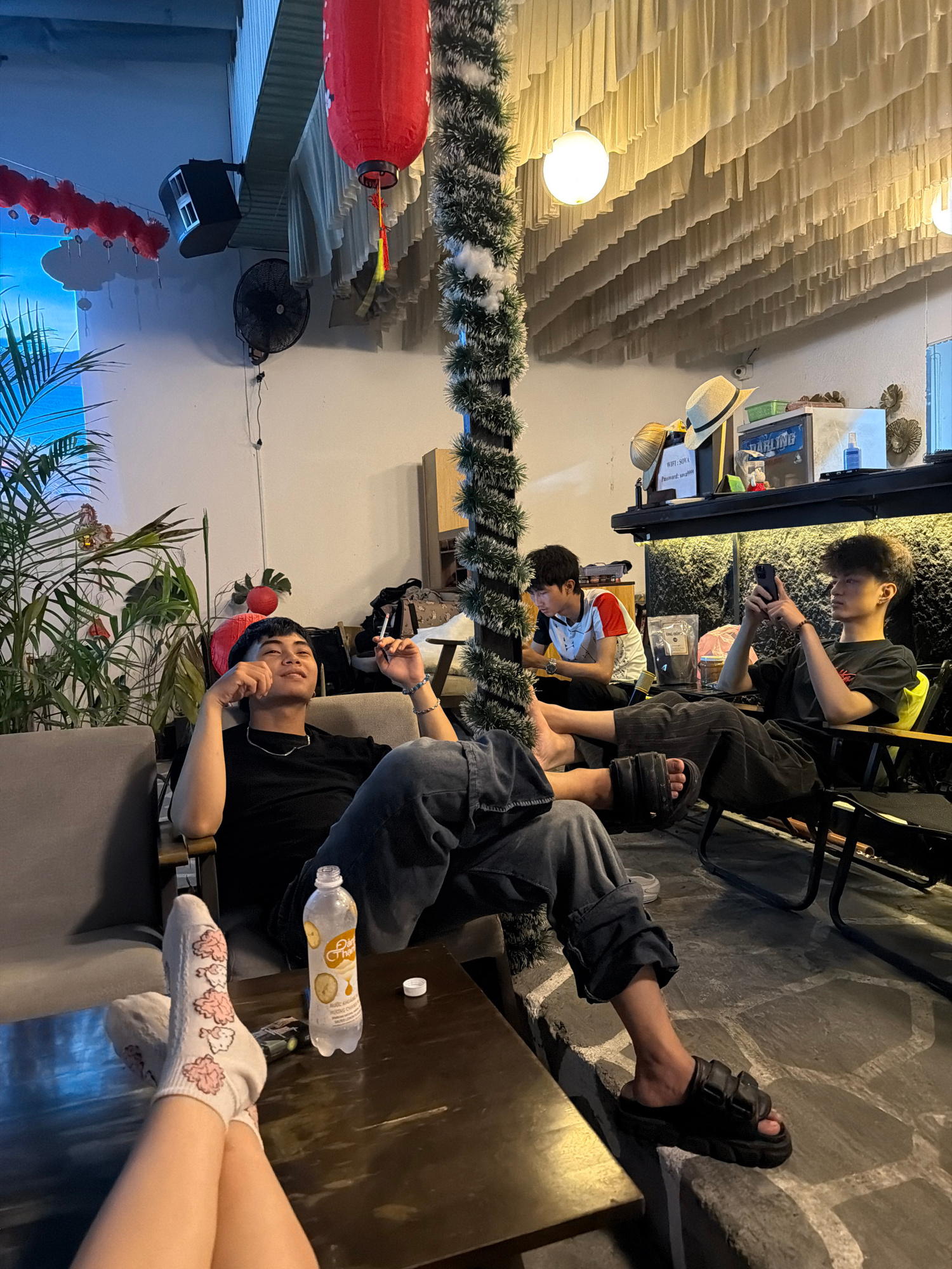 The image captures an indoor scene in Đà Nẵng, Vietnam. The primary focus is on several individuals relaxing in a café or similar establishment. A person wearing jeans and black sandals is reclining o…read more