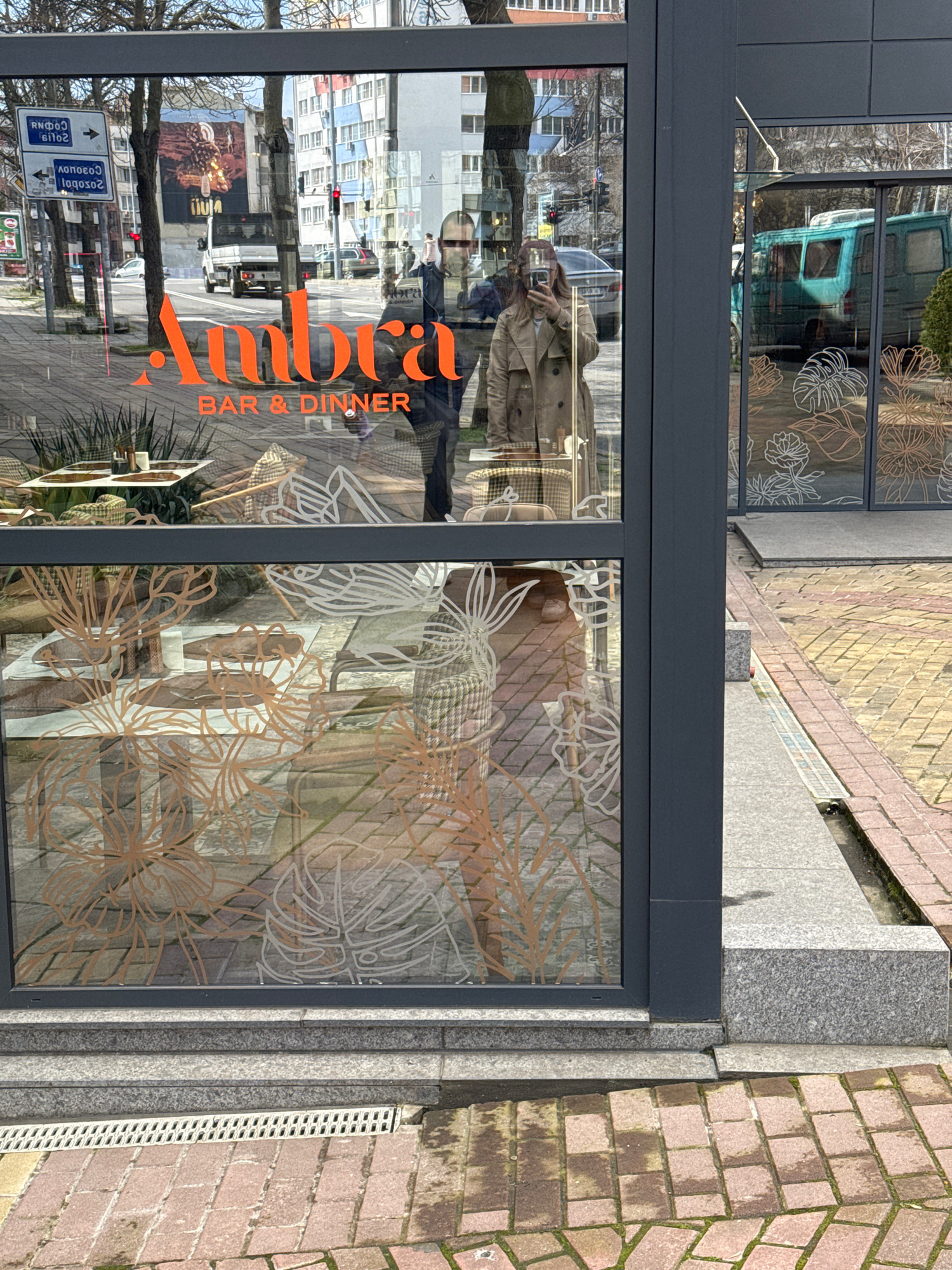 The image shows the storefront of "Ambra Bar & Dinner" in Burgas, Bulgaria. The large windows reflect the street scene, including buildings, traffic, and trees. A traffic sign pointing towards "София"…read more