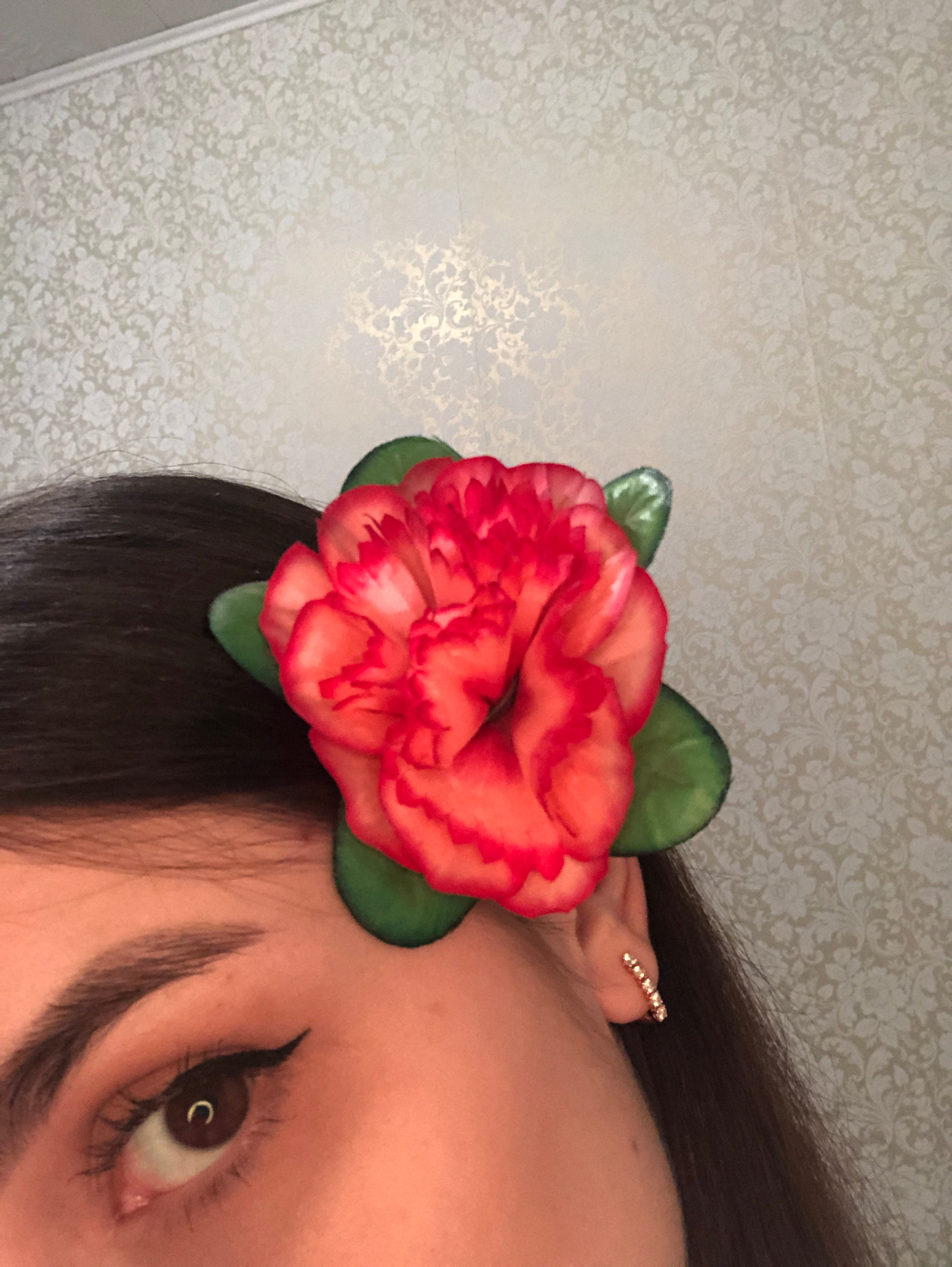 A close-up, angled shot features a person with dark hair. An orange flower with green leaves is positioned near their ear. They have an earring with stones. The person's eye is visible, showing a line…read more