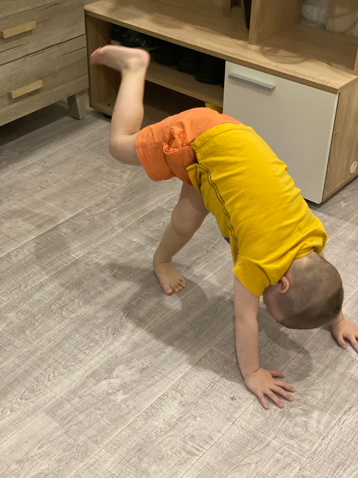 A young child, wearing a yellow shirt and orange shorts, is lying on a light grey wood-patterned floor. The child extends both arms forward and presses their hands on the floor. The child's head is tu…read more