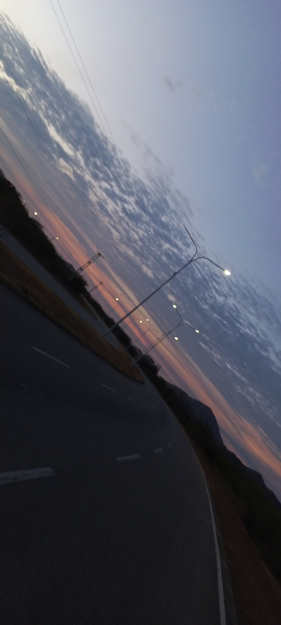 The image depicts a road with white lane markings, curving to the right and leading towards a distant mountain range. Streetlights are visible along the roadside. The sky shows a gradient of colors su…read more