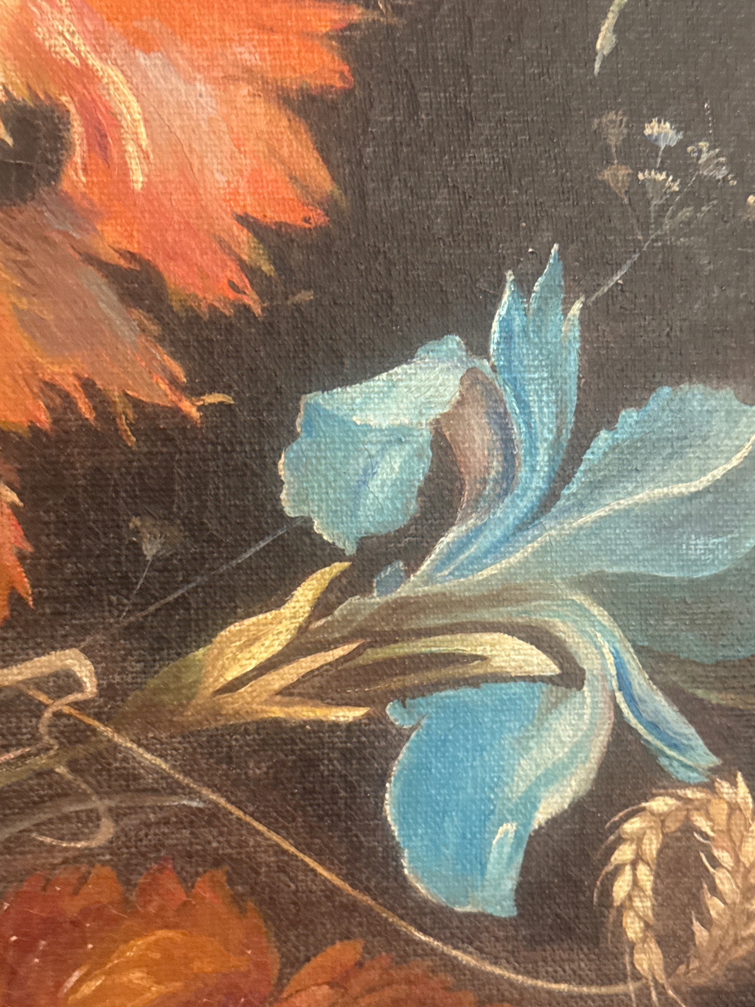 This is a close-up of a dark, possibly antique, floral oil painting. Predominantly featuring orange and blue hues, the composition includes a large, prominent blue flower, likely an iris, positioned c…read more