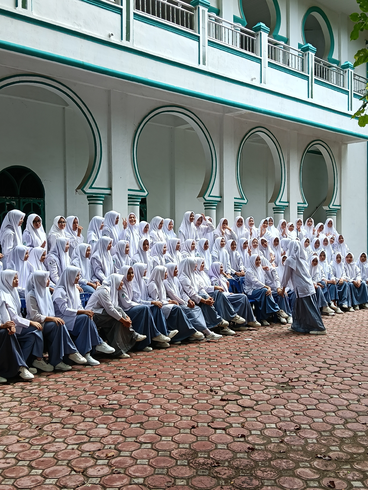 The image depicts a large group of young women, presumably students, gathered outdoors in Lhokseumawe, Indonesia. They are dressed in school uniforms consisting of white long-sleeved shirts, white hij…read more