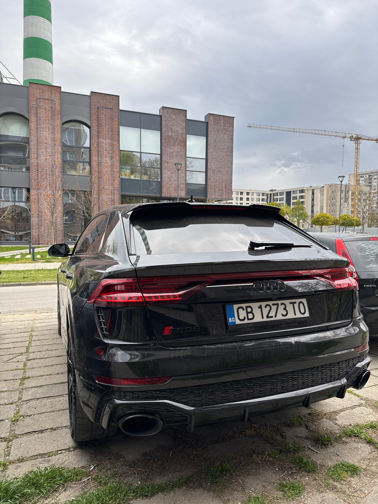 The image depicts the rear of a black Audi RSQ8 parked on a paved surface, likely a sidewalk or parking area. The car's license plate reads "CB 1273 TO," indicating registration in Bulgaria. The locat…read more