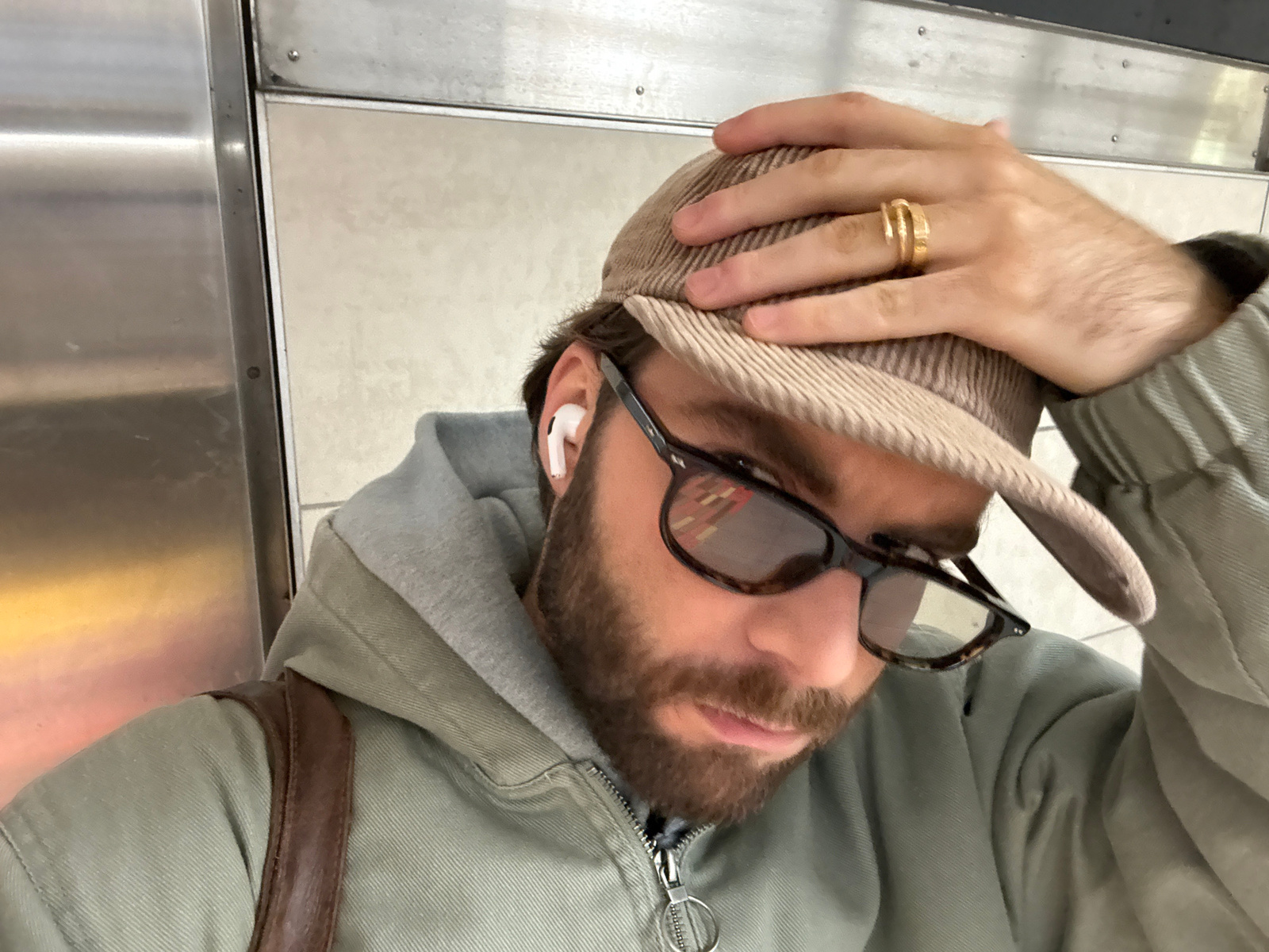 A man is posing for a selfie in what appears to be a public space, possibly a metro station, based on the tile and stainless steel finishes visible in the background. He is wearing a light green jacke…read more