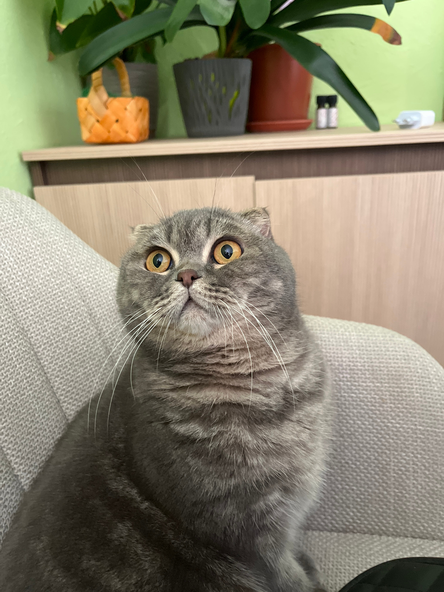 The image is a close-up of a grey Scottish Fold cat. The cat is positioned on a light grey upholstered chair. The background includes a potted plant with green leaves, a brown pot, a grey pot, a small…read more