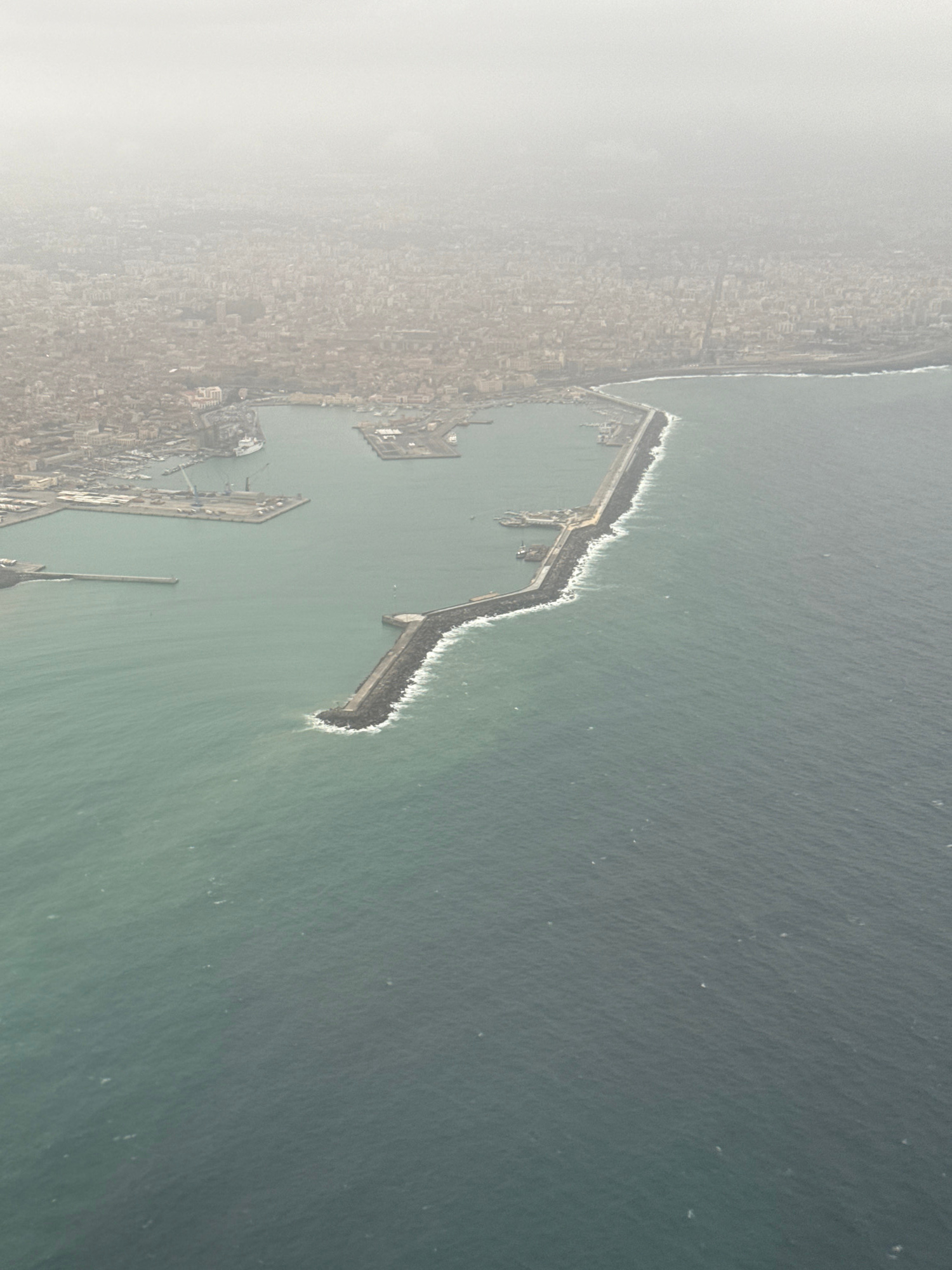 The image shows an aerial view of Catania, Italy. The foreground is dominated by the sea, and the breakwater structure of the port. The breakwater is a segmented, angled wall protecting the harbor fro…read more