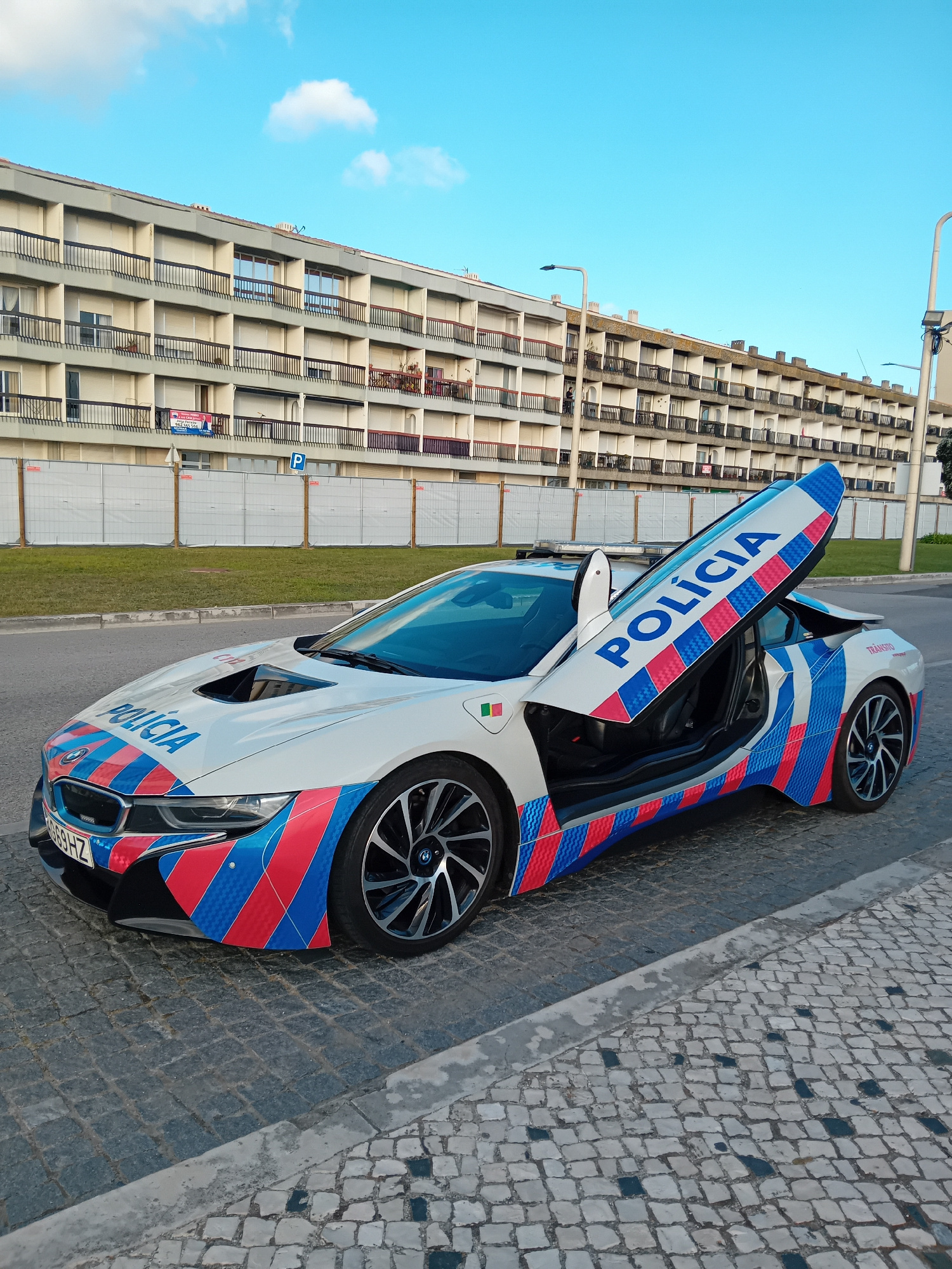 A white BMW i8 police car with the word "POLÍCIA" in blue lettering on its doors is parked on a cobblestone street in Figueira da Foz, Portugal. The car has red and blue stripes on its body. Its butte…read more