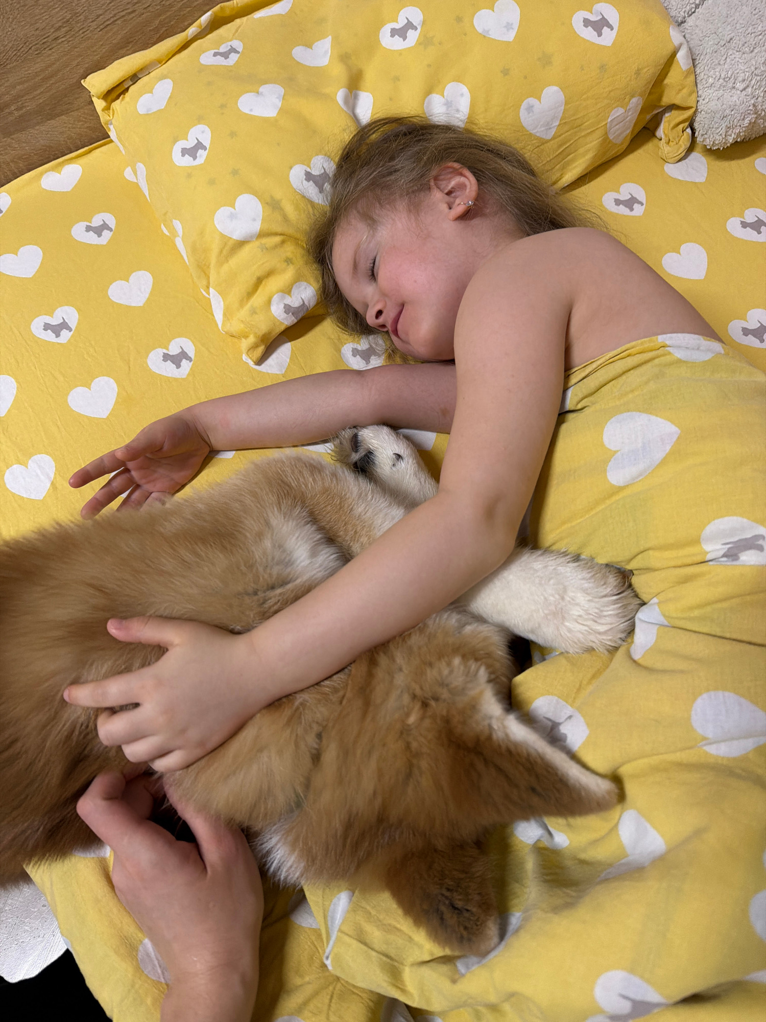 A child and a Shiba Inu-type dog are lying on a yellow bedspread with white heart patterns. The child, with light skin and blonde hair, is on their side with their eyes closed. One arm is wrapped arou…read more