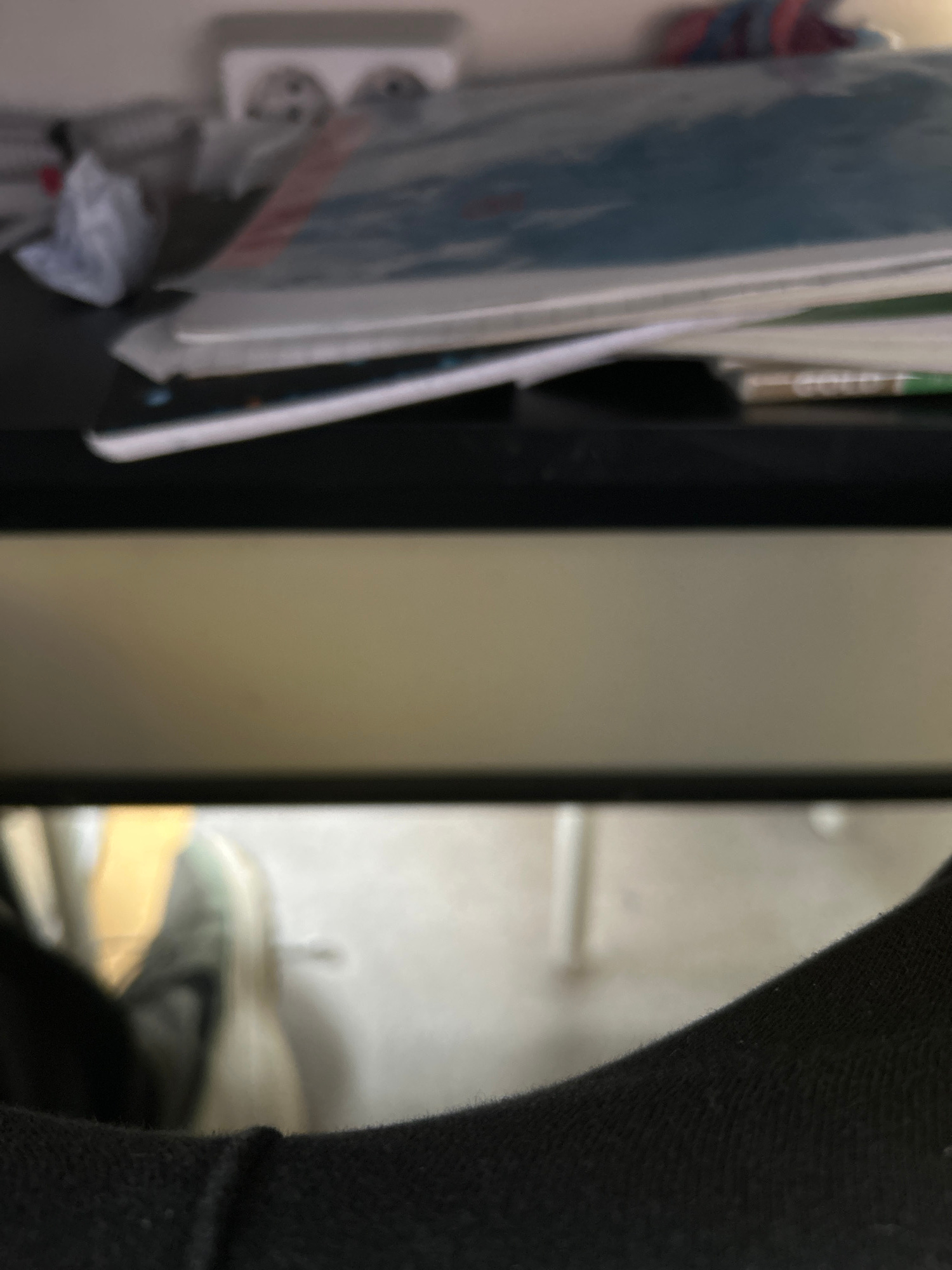 The image depicts a close-up view of an interior space. The foreground contains an electrical outlet, various papers and books, and a black object. The background is blurred, but shows a white wall wi…read more