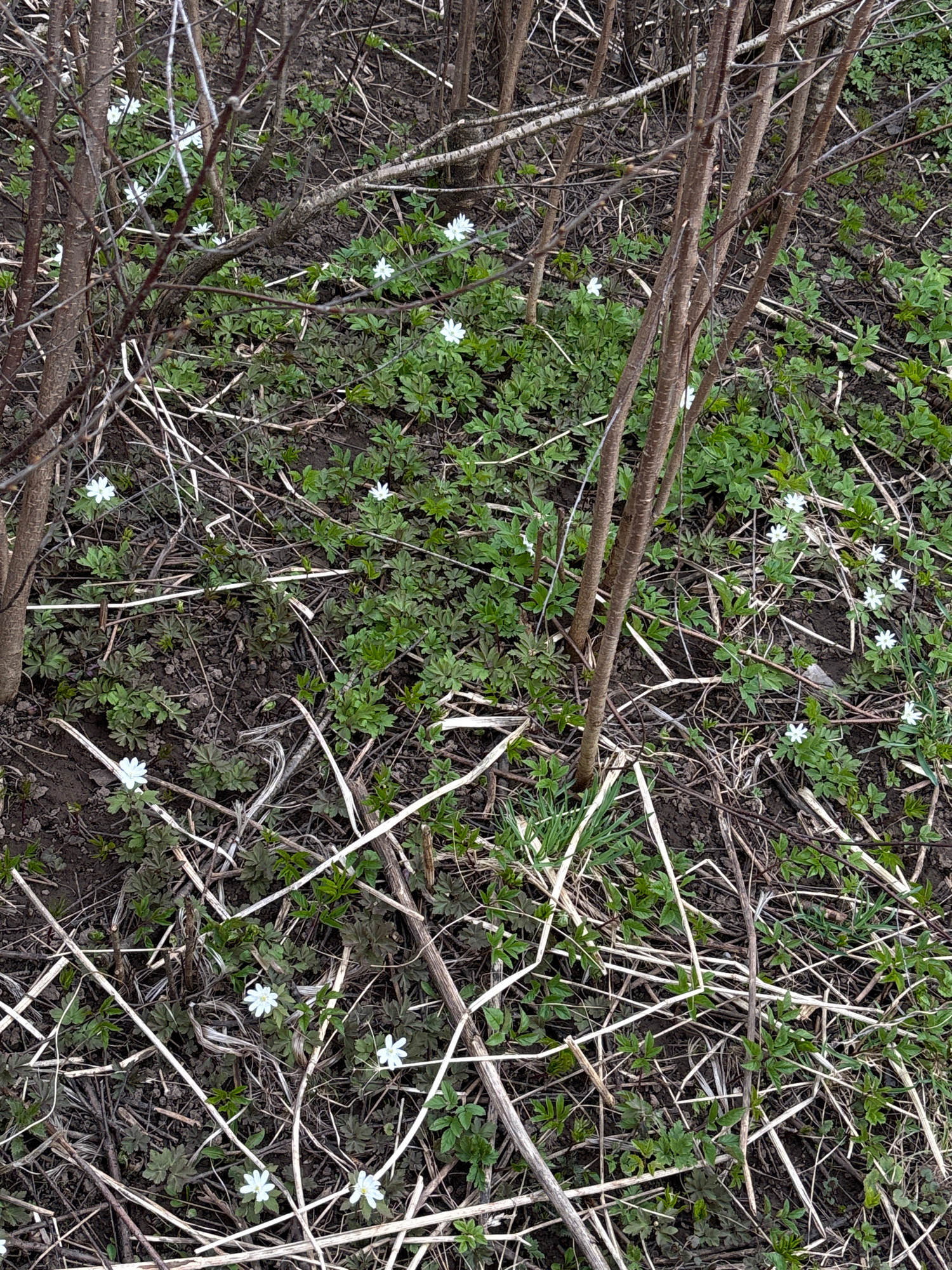 The image captures a close-up, overhead view of a natural ground cover in Фоки, Russia, likely during springtime. The scene is a rich tapestry of organic elements, featuring small white flowers, lush…read more