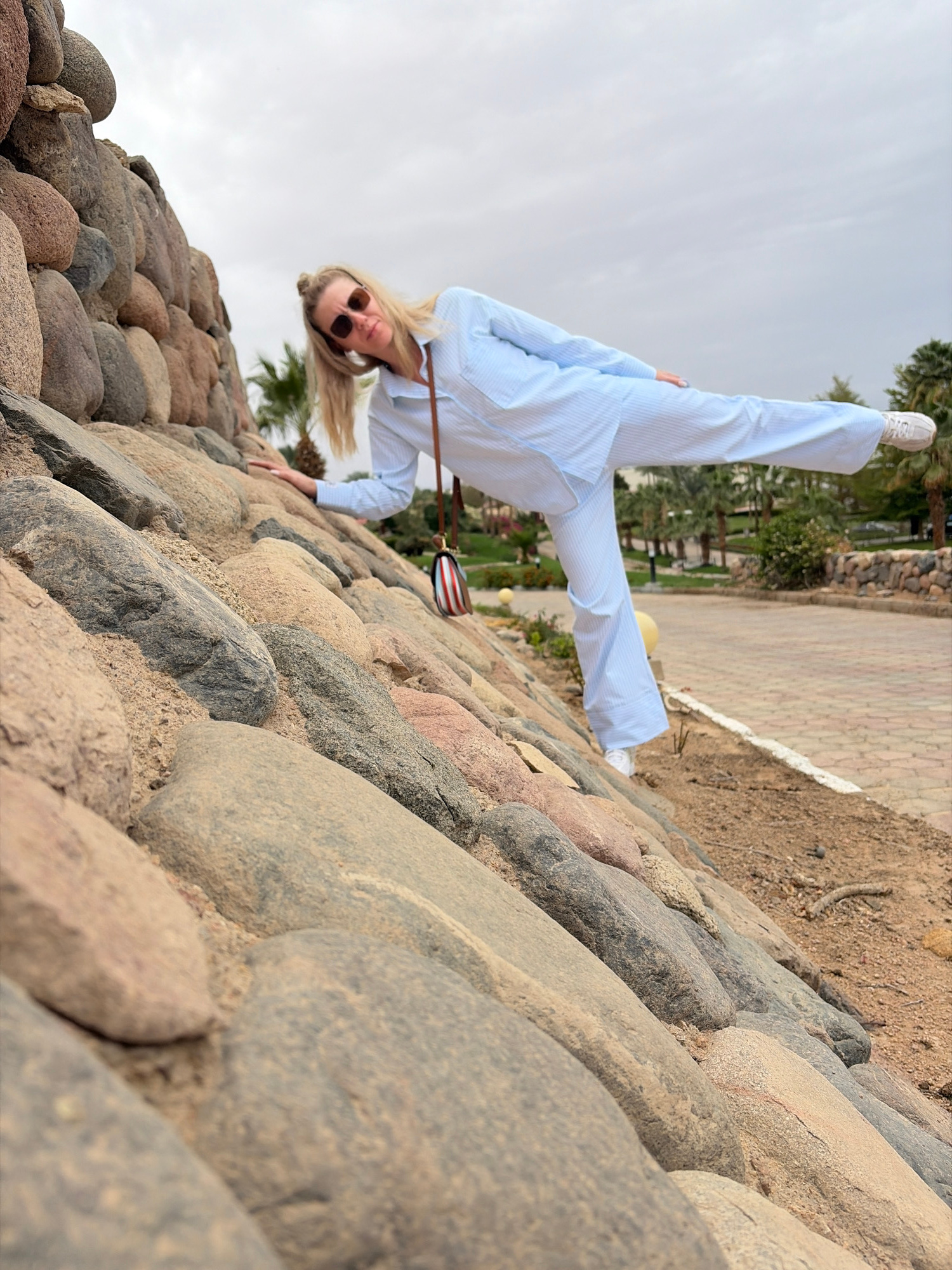 A woman is doing a handstand on a rock wall in Sharm El Sheikh, Egypt. The woman is wearing a light blue striped suit and white sneakers, with sunglasses on her face. She has blonde hair. The rock wal…read more