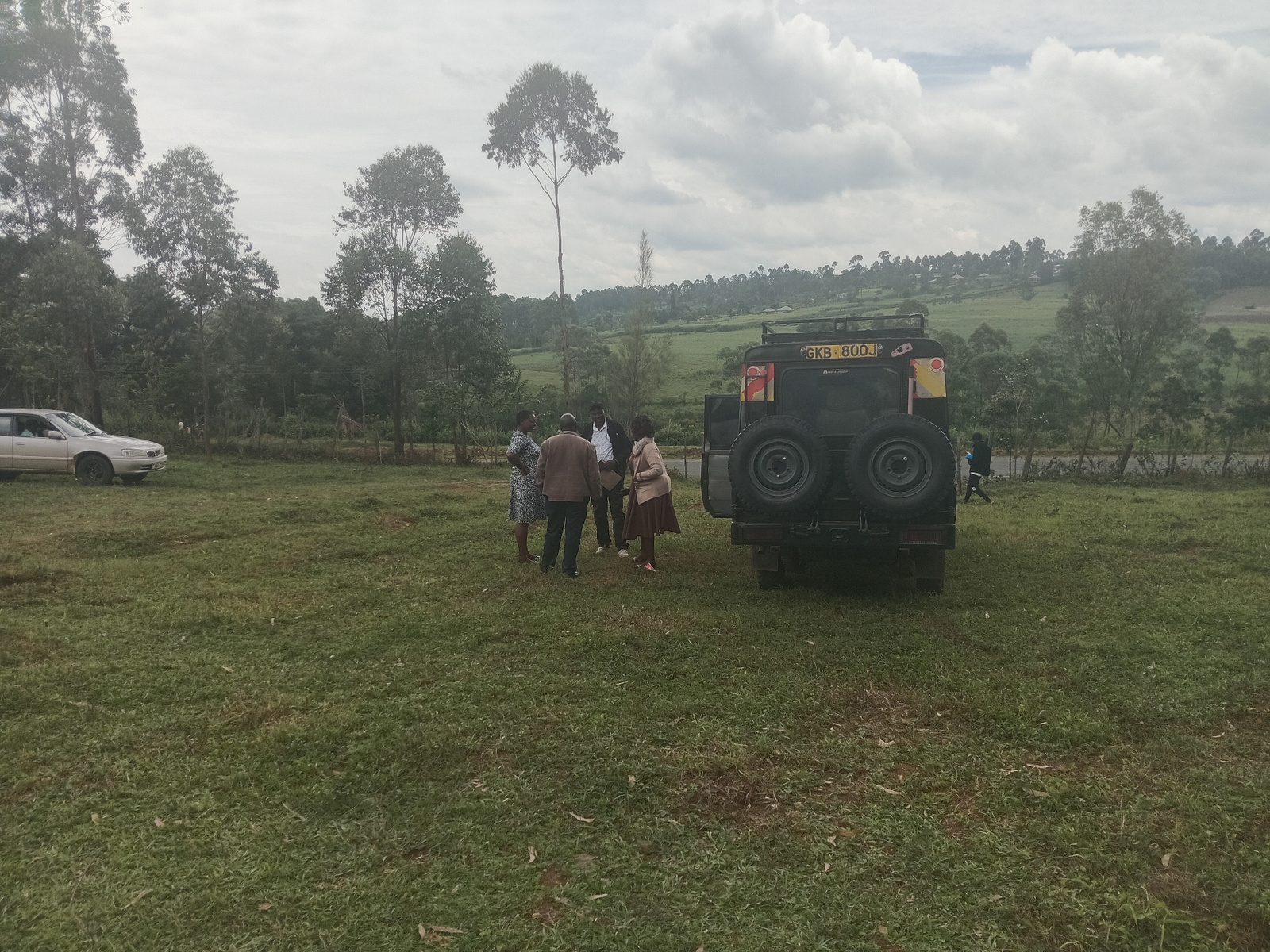 The image shows a group of four individuals gathered near a dark-colored, possibly military-style, vehicle in a grassy field. The vehicle has two spare tires mounted on the rear and a license plate re…read more