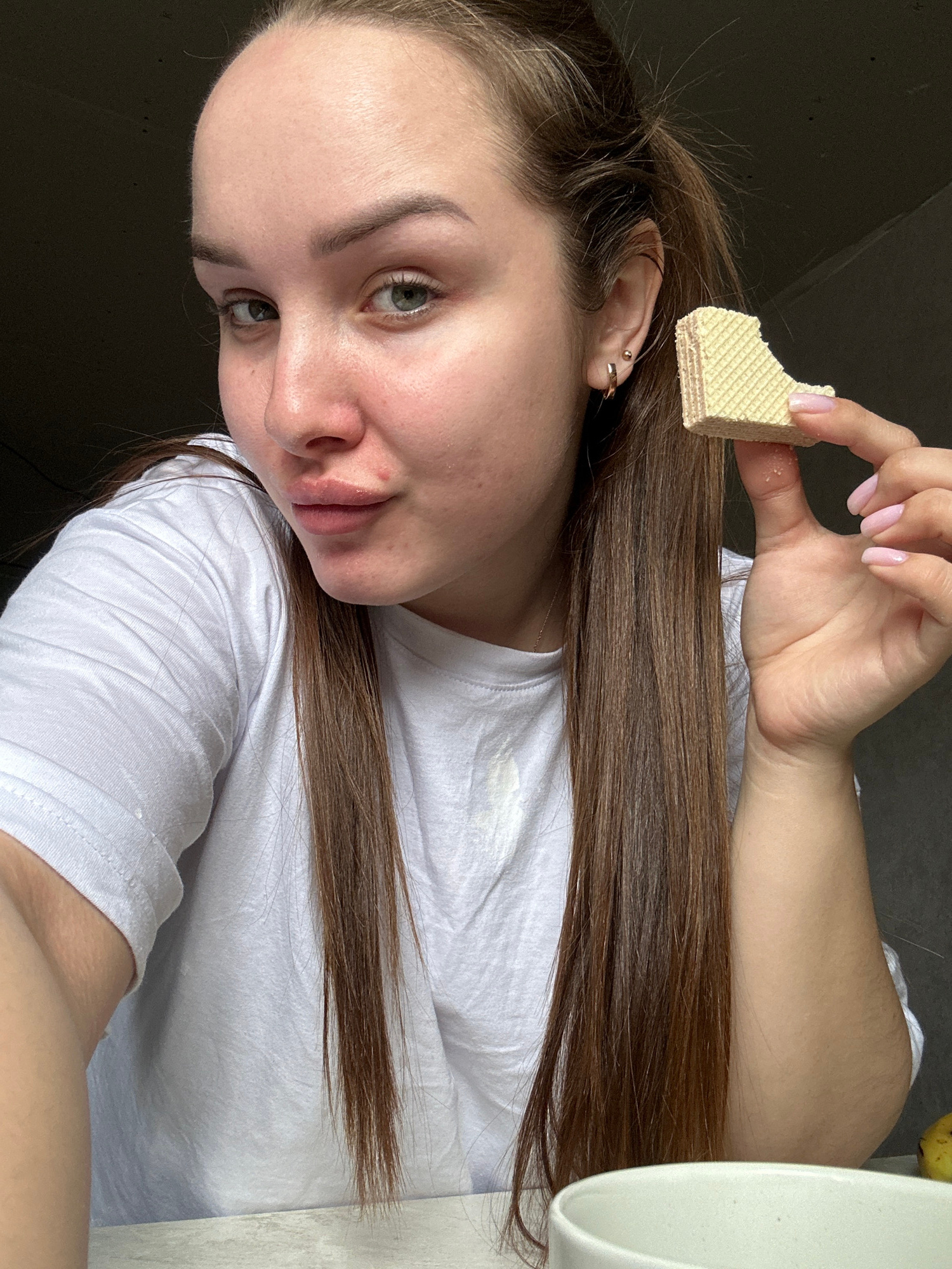 A woman with light skin, long brown hair, and green eyes is holding a piece of a square wafer cookie in her right hand. She is wearing a white t-shirt. Her head is tilted towards the camera. She has p…read more