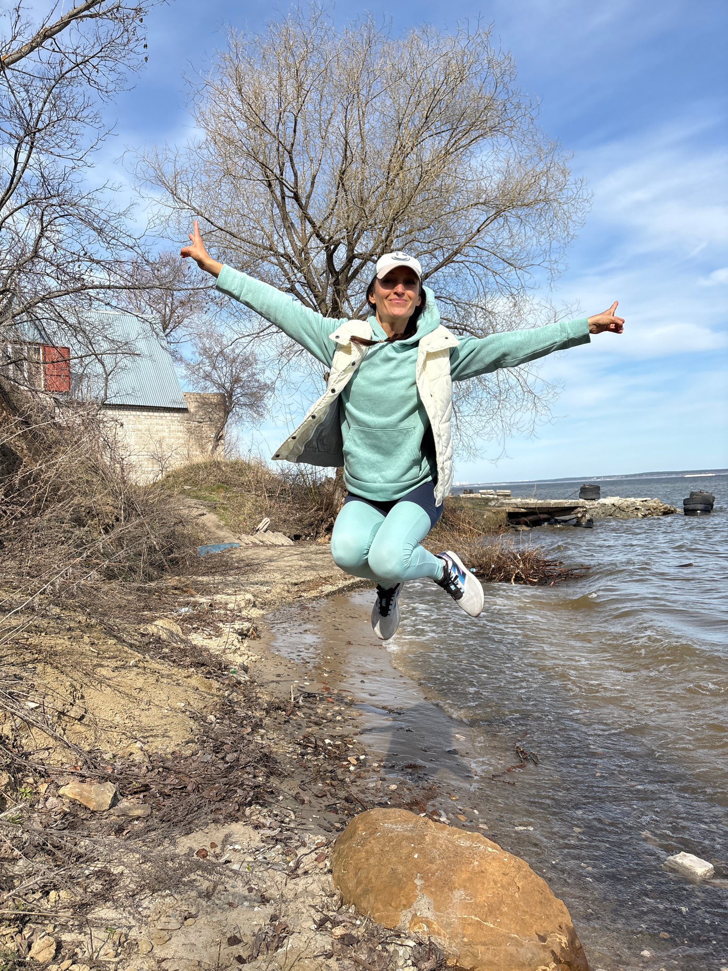 A dynamic outdoor shot captures a woman leaping mid-air with outstretched arms, expressing joy and freedom. She is dressed in a light mint green hoodie and matching leggings, a white puffer vest, a wh…read more