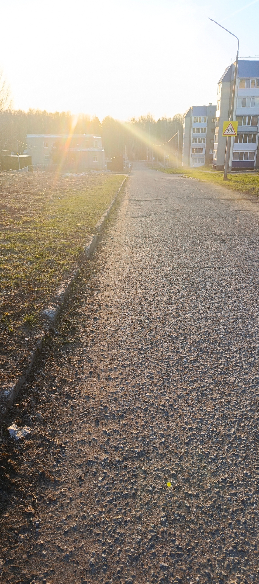 The image depicts a sunlit asphalt road in a residential area of Unknown, Unknown. The road, textured and with a curb, runs into the distance. To the left of the road is a grassy verge with a concrete…read more