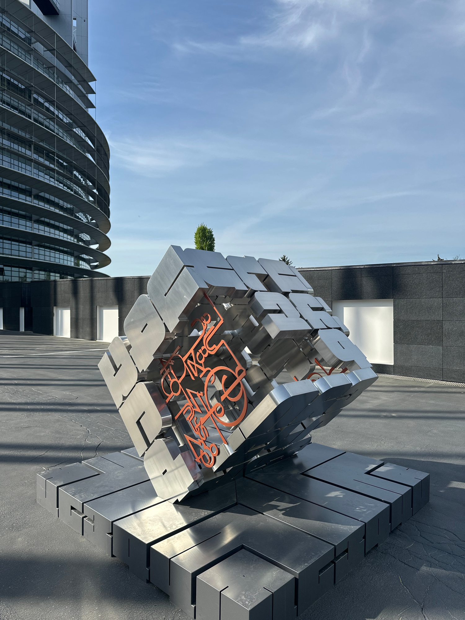 The image captures a modern urban landscape in Strasbourg, France, under a clear blue sky dotted with wispy white clouds. The central subject is a large, metallic sculptural installation shaped like a…read more