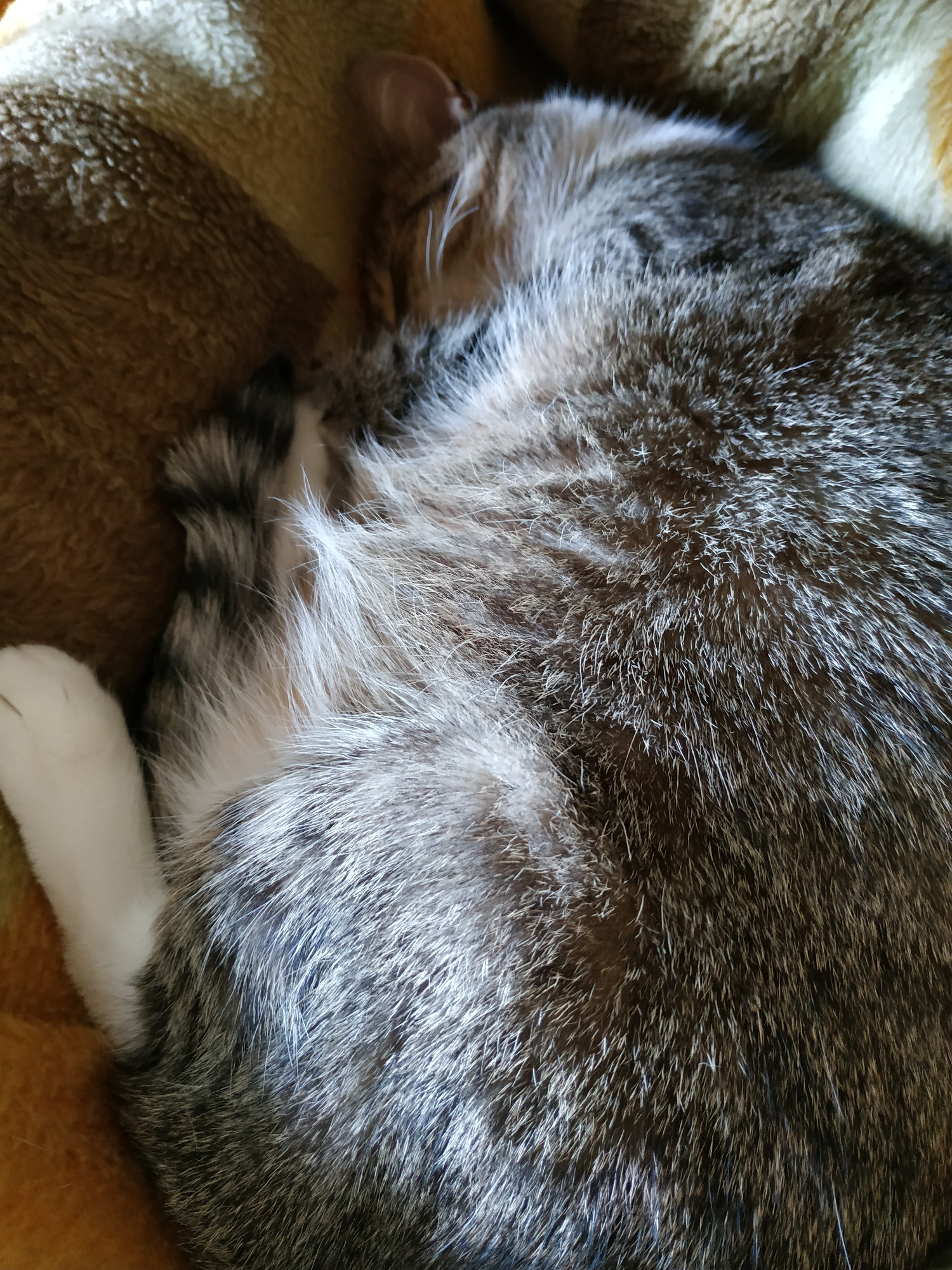 A close-up shot captures a sleeping cat resting on a brown and beige blanket. The cat is gray and white, with its head tucked down and a white paw visible near the bottom. The location in Dortmund, Ge…read more