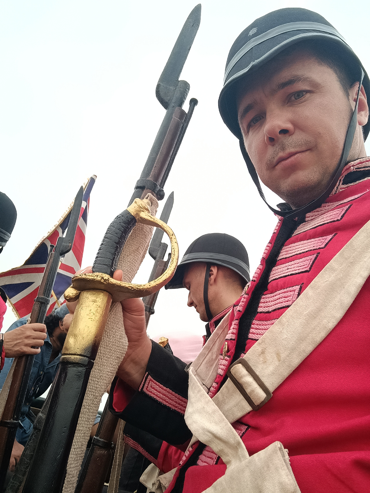 The image displays a group of individuals in historical military attire, positioned outdoors in Kottalapalli, India. In the foreground, a male subject wears a black helmet with a chin strap, a red mil…read more