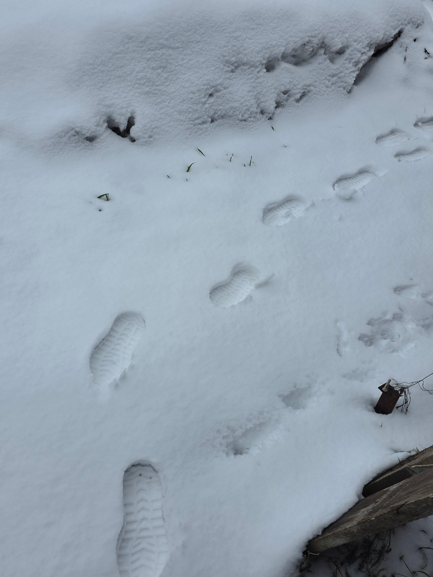 The image shows a snow-covered ground with multiple footprints, likely from a person wearing footwear with patterned soles. The footprints suggest a walking path across the snow. There is a wooden str…read more