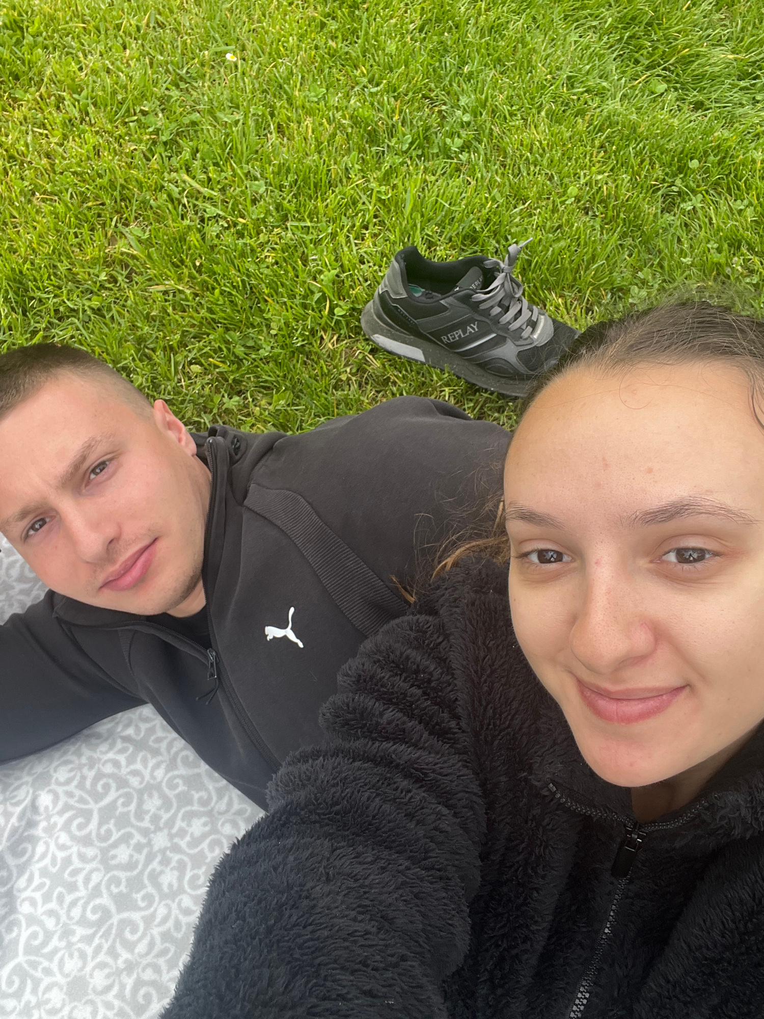 This overhead shot captures two individuals, a woman and a man, relaxing together outdoors. They are lying on green grass, with a patterned white and grey blanket or mat visible underneath the man. T…read more