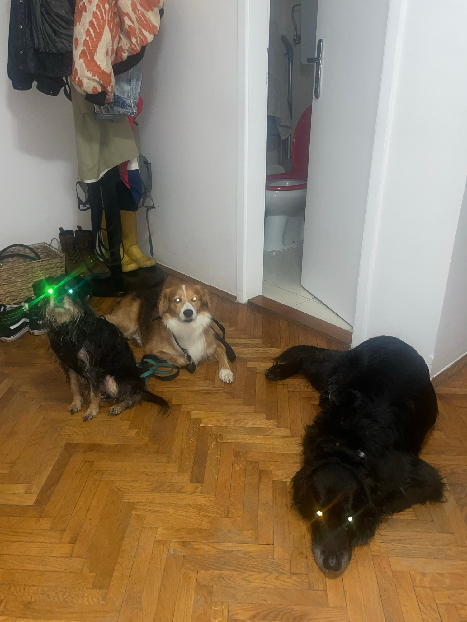 The image captures an indoor scene in Belgrade, Serbia, featuring three dogs. A large, black dog rests on a parquet wooden floor. Beside it, a medium-sized brown and white dog sits with a blue leash a…read more