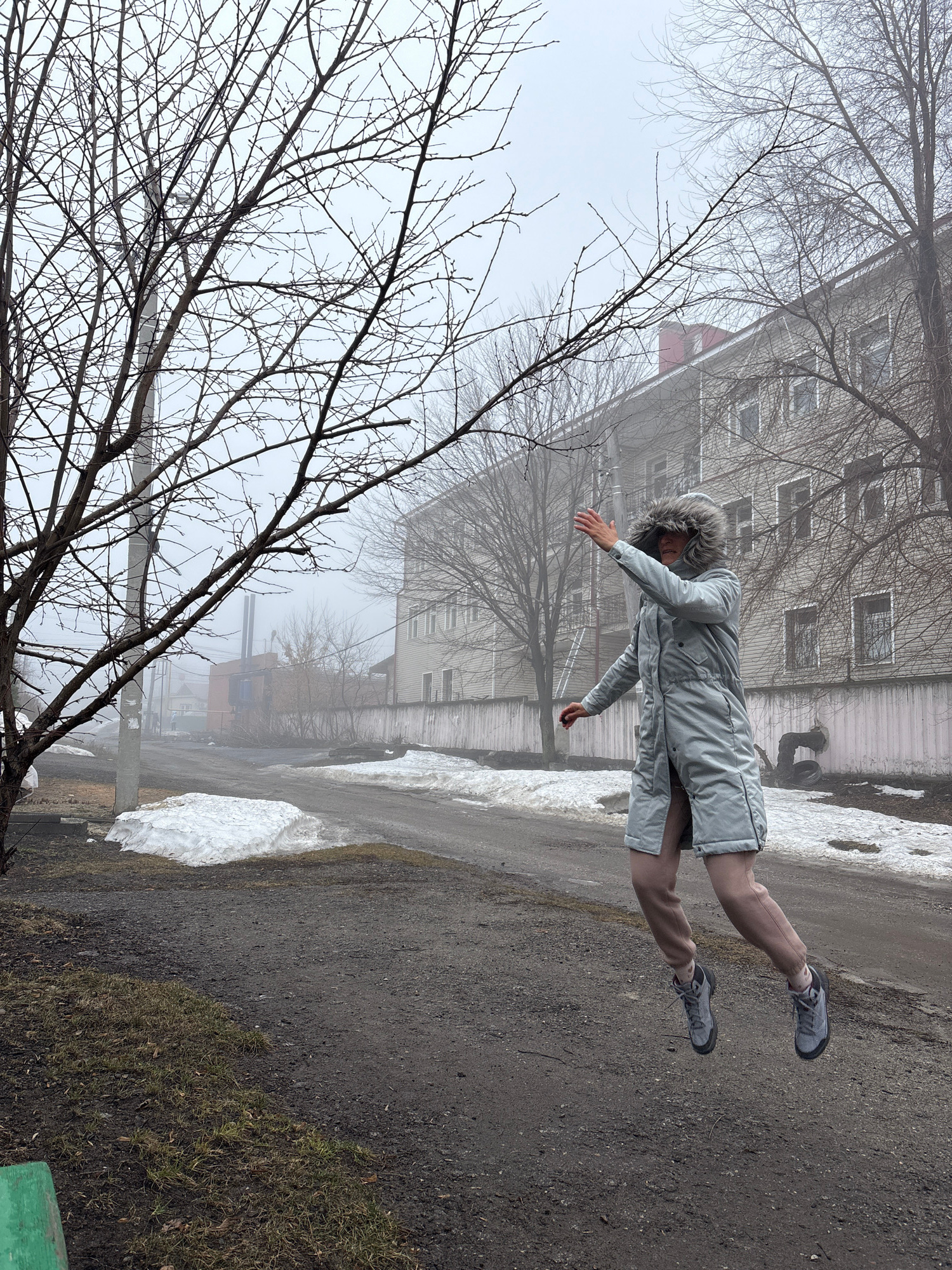 The image presents a scene in Ulyanovsk, Russia, set on a foggy day. A person wearing a light gray coat with a fur-lined hood, light brown pants, and gray shoes appears to be suspended horizontally in…read more