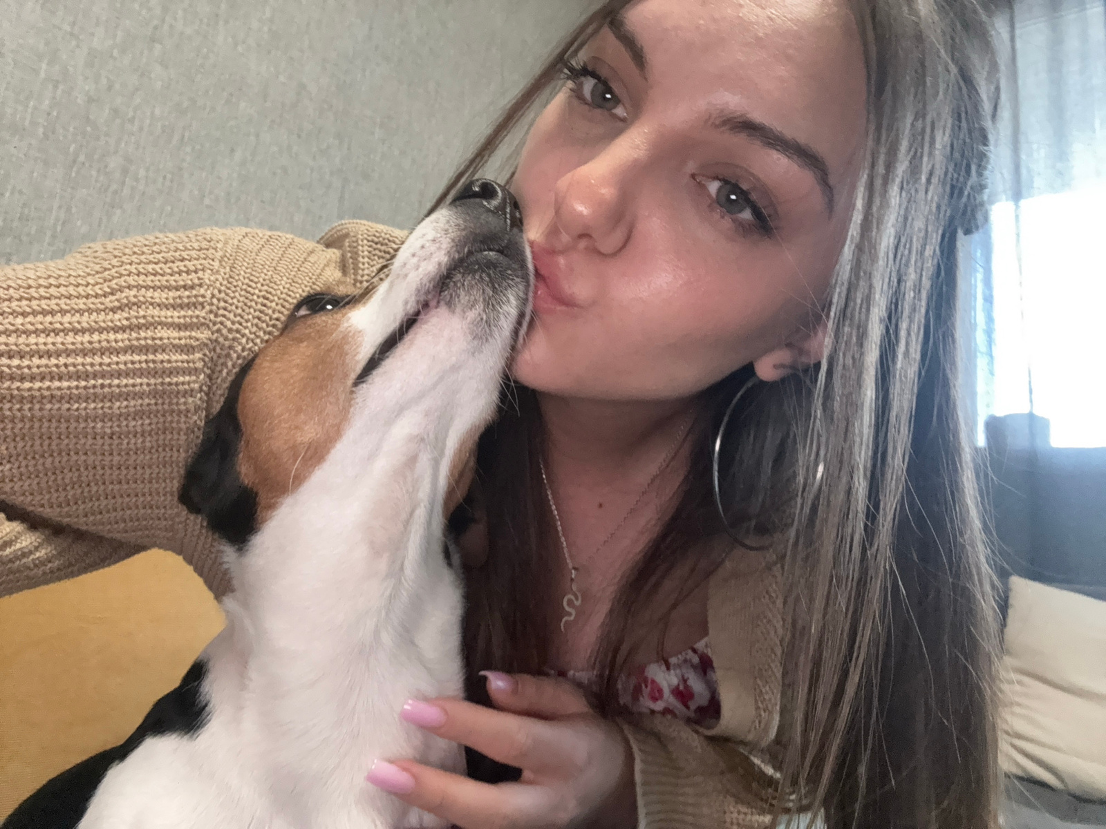 A woman is lying down and facing the camera. She is wearing a tan sweater, a white shirt with a red floral print, and a silver snake necklace. She has long brown hair, silver hoop earrings, and pink m…read more
